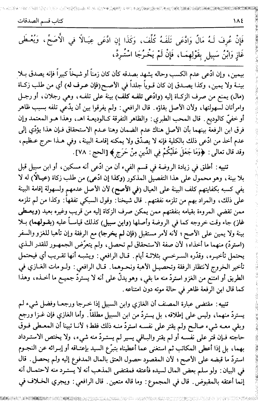 تَنْبِيهٌ أَطْلَقَ فِي زِيَادَةِ الرَّوْضَةِ فِي قَسْمِ الْفَيْءِ أَنَّ مَنْ ادَّعَى أَنَّهُ مِسْكِينٌ، أَوْ ابْنُ سَبِيلٍ قُبِلَ بِلَا بَيِّنَةٍ، وَهُوَ مَحْمُولٌ عَلَى هَذَا التَّفْصِيلِ الْمَذْكُورِ (وَكَذَا إنْ ادَّعَى) مَنْ طَلَبَ زَكَاةً (عِيَالًا) لَهُ لَا يَفِي كَسْبُهُ بِكِفَايَتِهِمْ كُلِّفَ الْبَيِّنَةَ عَلَى الْعِيَالِ (فِي الْأَصَحِّ) لِأَنَّ الْأَصْلَ عَدَمُهُمْ وَلِسُهُولَةِ إقَامَةِ الْبَيِّنَةِ عَلَى ذَلِكَ، وَالْمُرَادُ بِهِمْ مَنْ تَلْزَمُهُ نَفَقَتُهُمْ. قَالَ شَيْخُنَا: وَقَوْلُ السُّبْكِيّ تَفَقُّهًا: وَكَذَا مَنْ لَمْ تَلْزَمْهُ مِمَّنْ تَقْضِي الْمُرُوءَةُ بِقِيَامِهِ بِنَفَقَتِهِمْ مِمَّنْ يُمْكِنُ صَرْفُ الزَّكَاةِ إلَيْهِ مِنْ قَرِيبٍ وَغَيْرِهِ بَعِيدٍ.