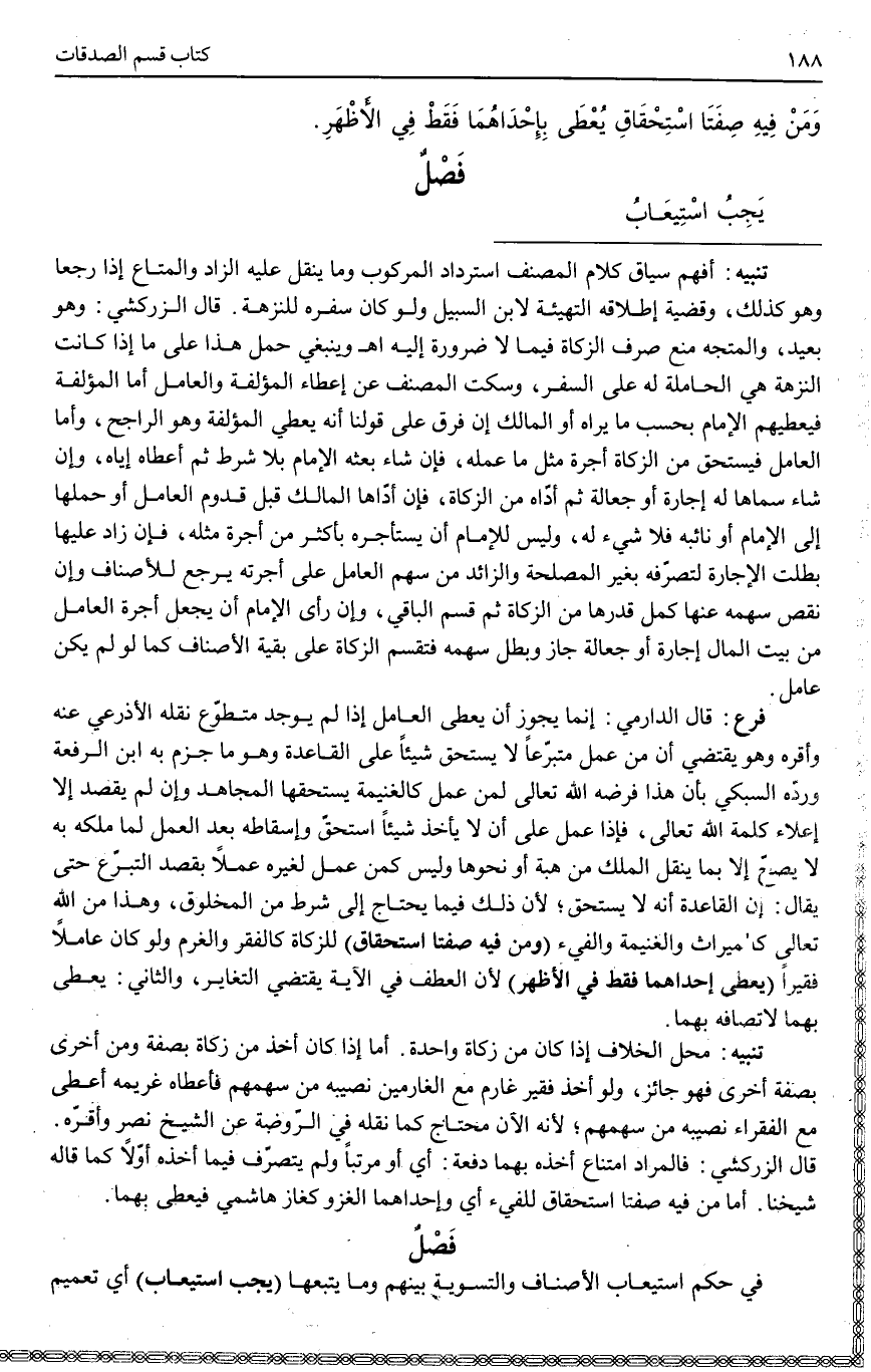 فَصْلٌ فِي حُكْمِ اسْتِيعَابِ الْأَصْنَافِ وَالتَّسْوِيَةِ بَيْنَهُمْ وَمَا يَتْبَعُهَا (يَجِبُ اسْتِيعَابُ) أَيْ تَعْمِيمُ