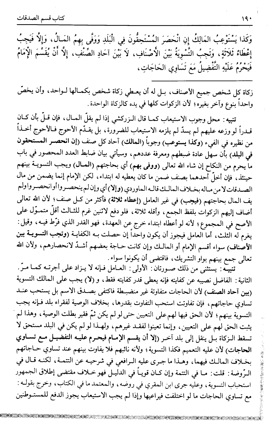 تَنْبِيهٌ مَحَلُّ وُجُوبِ الِاسْتِيعَابِ كَمَا قَالَ الزَّرْكَشِيُّ إذَا لَمْ يَقِلَّ الْمَالُ، فَإِنْ قَلَّ بِأَنْ كَانَ قَدْرًا لَوْ وَزَّعَهُ عَلَيْهِمْ لَمْ يَسُدَّ لَمْ يَلْزَمْهُ الِاسْتِيعَابُ لِلضَّرُورَةِ، بَلْ يُقَدِّمُ الْأَحْوَجَ فَالْأَحْوَجَ أَخْذًا مِنْ نَظِيرِهِ فِي الْفَيْءِ (وَكَذَا يَسْتَوْعِبُ) وُجُوبًا (الْمَالِكُ) آحَادَ كُلَّ صِنْفٍ (إنْ انْحَصَرَ الْمُسْتَحِقُّونَ فِي الْبَلَدِ) بِأَنْ سَهُلَ عَادَةً ضَبْطُهُمْ وَمَعْرِفَةُ عَدَدِهِمْ، وَسَيَأْتِي بَيَانُ ضَابِطِ الْعَدَدِ الْمَحْصُورِ فِي بَابِ مَا يَحْرُمُ مِنْ النِّكَاحِ إنْ شَاءَ اللَّهُ - تَعَالَى - (وَوَفَّى بِهِمْ) أَيْ بِحَاجَتِهِمْ (الْمَالُ) وَيَجِبُ التَّسْوِيَةُ بَيْنَهُمْ حِينَئِذٍ، فَإِنْ أَخَلَّ أَحَدُهُمَا بِصِنْفٍ ضَمِنَ مَا كَانَ يُعْطِيهِ لَهُ ابْتِدَاءً، لَكِنَّ الْإِمَامَ إنَّمَا يَضْمَنُ مِنْ مَالِ الصَّدَقَاتِ لَا مِنْ مَالِهِ بِخِلَافِ الْمَالِكِ قَالَهُ الْمَاوَرْدِيُّ (وَإِلَّا) أَيْ وَإِنْ لَمْ يَنْحَصِرُوا أَوْ انْحَصَرُوا وَلَمْ يَفِ الْمَالُ بِحَاجَتِهِمْ (فَيَجِبُ) فِي غَيْرِ الْعَامِلِ (إعْطَاءُ ثَلَاثَةٍ) فَأَكْثَرَ مِنْ كُلِّ صِنْفٍ؛ لِأَنَّ اللَّهَ - تَعَالَى - أَضَافَ إلَيْهِمْ الزَّكَوَاتِ بِلَفْظِ الْجَمْعِ، وَأَقَلُّهُ ثَلَاثَةٌ، فَلَوْ دَفَعَ لِاثْنَيْنِ غَرِمَ لِلثَّالِثِ أَقَلَّ مُتَمَوِّلٍ عَلَى الْأَصَحِّ فِي الْمَجْمُوعِ؛ لِأَنَّهُ لَوْ أَعْطَاهُ ابْتِدَاءً خَرَجَ عَنْ الْعُهْدَةِ، فَهُوَ الْقَدْرُ الَّذِي فَرَّطَ فِيهِ، وَقِيلَ: يَغْرَمُ لَهُ الثُّلُثَ، أَمَّا الْعَامِلُ فَيَجُوزُ أَنْ يَكُونَ وَاحِدًا إنْ حَصَلَتْ بِهِ الْكِفَايَةُ (وَتَجِبُ التَّسْوِيَةُ بَيْنَ الْأَصْنَافِ) سَوَاءٌ أَقَسَمَ الْإِمَامُ أَوْ الْمَالِكُ وَإِنْ كَانَتْ حَاجَةُ بَعْضِهِمْ أَشَدَّ لِانْحِصَارِهِمْ، وَلِأَنَّ اللَّهَ - تَعَالَى - جَمَعَ بَيْنَهُمْ بِوَاوِ التَّشْرِيكِ، فَاقْتَضَى أَنْ يَكُونُوا سَوَاءً.