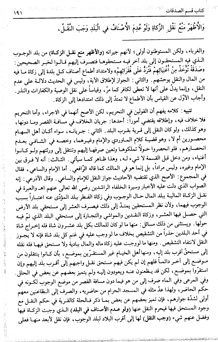 (وَالْأَظْهَرُ مَنْعُ نَقْلِ الزَّكَاةِ) مِنْ بَلَدِ الْوُجُوبِ الَّذِي فِيهِ الْمُسْتَحِقُّونَ إلَى بَلَدٍ آخَرَ فِيهِ مُسْتَحِقُّوهَا فَتُصْرَفُ إلَيْهِمْ قَالُوا لِخَبَرِ الصَّحِيحَيْنِ: «صَدَقَةً تُؤْخَذُ مِنْ أَغْنِيَائِهِمْ فَتُرَدُّ عَلَى فُقَرَائِهِمْ» وَلِامْتِدَادِ أَطْمَاعِ أَصْنَافِ كُلِّ بَلْدَةٍ إلَى زَكَاةِ مَا فِيهِ مِنْ الْمَالِ وَالنَّقْلُ يُوحِشُهُمْ. وَالثَّانِي: الْجَوَازُ لِإِطْلَاقِ الْآيَةِ، وَلَيْسَ فِي الْحَدِيثِ دَلَالَةٌ عَلَى عَدَمِ النَّقْلِ، وَإِنَّمَا يَدُلُّ عَلَى أَنَّهَا لَا تُعْطَى لِكَافِرٍ كَمَا مَرَّ، وَقِيَاسًا عَلَى نَقْلِ الْوَصِيَّةِ وَالْكَفَّارَاتِ وَالنَّذْرِ.