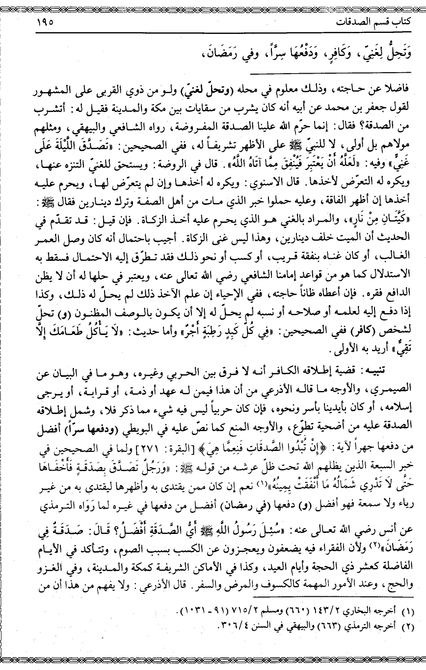(وَدَفْعُهَا سِرًّا) أَفْضَلُ مِنْ دَفْعِهَا جَهْرًا لِآيَةِ: {إِنْ تُبْدُوا الصَّدَقَاتِ فَنِعِمَّا هِيَ} [البقرة: 271] : وَلِمَا فِي الصَّحِيحَيْنِ فِي خَبَرِ السَّبْعَةِ الَّذِينَ يُظِلُّهُمْ اللَّهُ تَحْتَ ظِلِّ عَرْشِهِ مِنْ قَوْلِهِ - صَلَّى اللَّهُ عَلَيْهِ وَسَلَّمَ -: «وَرَجُلٌ تَصَدَّقَ بِصَدَقَةٍ فَأَخْفَاهَا حَتَّى لَا تَدْرِيَ شِمَالُهُ مَا أَنْفَقَتْ يَمِينُهُ» نَعَمْ إنْ كَانَ مِمَّنْ يُقْتَدَى بِهِ وَأَظْهَرَهَا لِيُقْتَدَى بِهِ مِنْ غَيْرِ رِيَاءٍ وَلَا سَمَعَةٍ فَهُوَ أَفْضَلُ.