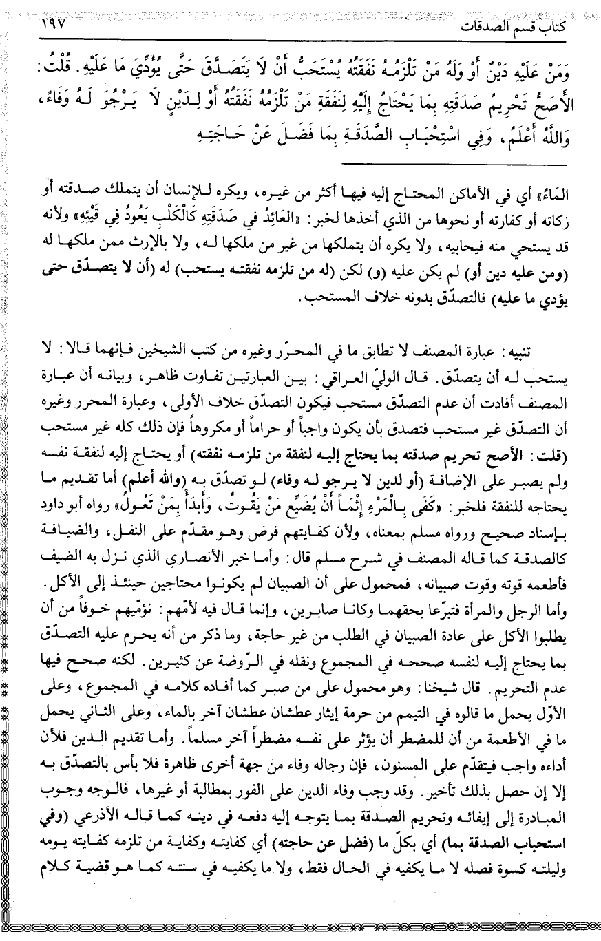 تَنْبِيهٌ عِبَارَةُ الْمُصَنِّفِ لَا تُطَابِقُ مَا فِي الْمُحَرَّرِ وَغَيْرِهِ مِنْ كُتُبِ الشَّيْخَيْنِ فَإِنَّهُمَا قَالَا: لَا يُسْتَحَبُّ لَهُ أَنْ يَتَصَدَّقَ. قَالَ الْوَلِيُّ الْعِرَاقِيُّ: بَيْنَ الْعِبَارَتَيْنِ تَفَاوُتٌ ظَاهِرٌ، وَبَيَانُهُ أَنَّ عِبَارَةَ الْمُصَنِّفِ أَفَادَتْ أَنَّ عَدَمَ التَّصَدُّقِ مُسْتَحَبٌّ فَيَكُونُ التَّصَدُّقُ خِلَافَ الْأَوْلَى، وَعِبَارَةُ الْمُحَرَّرِ وَغَيْرِهِ أَنَّ التَّصَدُّقَ غَيْرُ مُسْتَحَبٍّ فَتَصَدَّقَ بِأَنْ يَكُونَ وَاجِبًا أَوْ حَرَامًا أَوْ مَكْرُوهًا فَإِنَّ ذَلِكَ كُلَّهُ غَيْرُ مُسْتَحَبٍّ (قُلْتُ: الْأَصَحُّ تَحْرِيمُ صَدَقَتِهِ بِمَا يَحْتَاجُ إلَيْهِ لِنَفَقَةِ مَنْ تَلْزَمُهُ نَفَقَتُهُ) أَوْ يَحْتَاجُ إلَيْهِ لِنَفَقَةِ نَفْسِهِ وَلَمْ يَصْبِرْ عَلَى الْإِضَافَةِ (أَوْ لِدَيْنٍ لَا يَرْجُو لَهُ وَفَاءً) لَوْ تَصَدَّقَ بِهِ (وَاَللَّهُ أَعْلَمُ) أَمَّا تَقْدِيمُ مَا يَحْتَاجُهُ لِلنَّفَقَةِ فَلِخَبَرِ: «كَفَى بِالْمَرْءِ إثْمًا أَنْ يُضَيِّعَ مَنْ يَقُوتُ، وَأَبْدَأْ بِمَنْ تَعُولُ» رَوَاهُ أَبُو دَاوُد بِإِسْنَادٍ صَحِيحٍ وَرَوَاهُ مُسْلِمٌ بِمَعْنَاهُ.