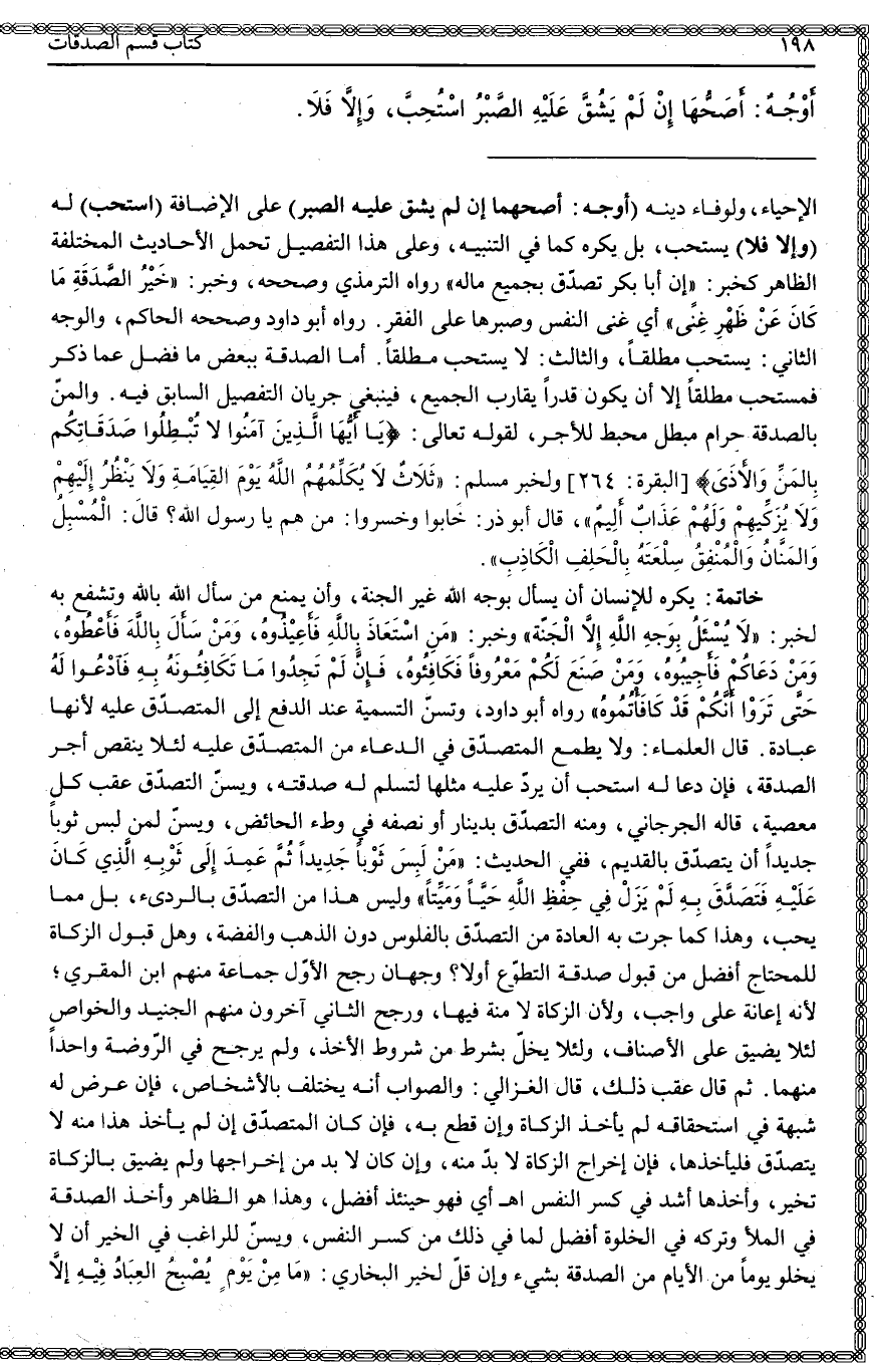 وَأَخْذُ الصَّدَقَةِ فِي الْمَلَأِ وَتَرْكُهُ فِي الْخَلْوَةِ أَفْضَلُ لِمَا فِي ذَلِكَ مِنْ كَسْرِ النَّفْسِ، وَيُسَنُّ لِلرَّاغِبِ فِي الْخَيْرِ أَنْ لَا يَخْلُوَ يَوْمًا مِنْ الْأَيَّامِ مِنْ الصَّدَقَةِ بِشَيْءٍ وَإِنْ قَلَّ لِخَبَرِ الْبُخَارِيِّ: