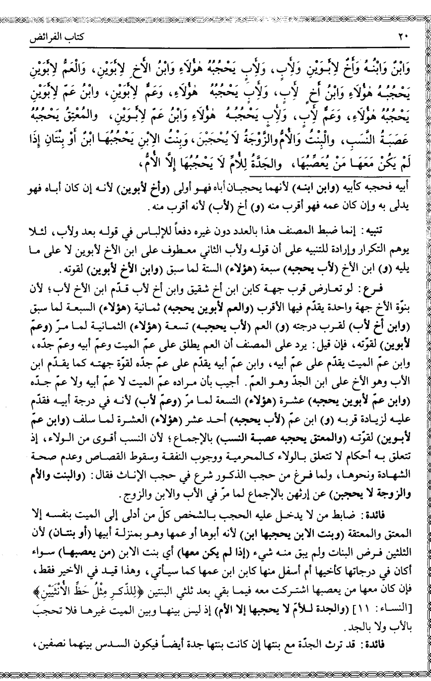 فَرْعٌ: لَوْ تَعَارَضَ قُرْبُ جِهَةٍ كَابْنِ ابْنِ أَخٍ شَقِيقٍ وَابْنِ أَخٍ لِأَبٍ قُدِّمَ ابْنُ الْأَخِ لِأَبٍ؛ لِأَنَّ بُنُوَّةَ الْأَخِ جِهَةٌ وَاحِدَةٌ يُقَدَّمُ فِيهَا الْأَقْرَبُ (وَالْعَمُّ لِأَبَوَيْنِ يَحْجُبُهُ) ثَمَانِيَةٌ (هَؤُلَاءِ) السَّبْعَةُ لِمَا سَبَقَ (وَابْنُ أَخٍ لِأَبٍ) لِقُرْبِ دَرَجَتِهِ (وَ) الْعَمُّ (لِأَبٍ يَحْجُبُهُ) تِسْعَةٌ (هَؤُلَاءِ) الثَّمَانِيَةُ لِمَا مَرَّ (وَعَمٌّ لِأَبَوَيْنِ) لِقُوَّتِهِ، فَإِنْ قِيلَ: يُرَدُّ عَلَى الْمُصَنِّفِ أَنَّ الْعَمَّ يُطْلَقُ عَلَى عَمِّ الْمَيِّتِ وَعَمِّ أَبِيهِ وَعَمِّ جَدِّهِ، وَابْنُ عَمِّ الْمَيِّتِ يُقَدَّمُ عَلَى عَمِّ أَبِيهِ، وَابْنُ عَمِّ أَبِيهِ يُقَدَّمُ عَلَى عَمِّ جَدِّهِ لِقُوَّةِ جِهَتِهِ كَمَا يُقَدَّمُ ابْنُ الْأَبِ وَهُوَ الْأَخُ عَلَى ابْنِ الْجَدِّ وَهُوَ الْعَمُّ. أُجِيبَ بِأَنَّ مُرَادَهُ عَمُّ الْمَيِّتِ لَا عَمُّ أَبِيهِ وَلَا عَمُّ جَدِّهِ (وَابْنُ عَمٍّ لِأَبَوَيْنِ يَحْجُبُهُ) عَشَرَةٌ (هَؤُلَاءِ) التِّسْعَةُ لِمَا مَرَّ (وَعَمٌّ لِأَبٍ) لِأَنَّهُ فِي دَرَجَةِ أَبِيهِ فَقُدِّمَ عَلَيْهِ لِزِيَادَةِ قُرْبِهِ (وَ) ابْنُ عَمٍّ (لِأَبٍ يَحْجُبُهُ) أَحَدَ عَشَرَ (هَؤُلَاءِ) الْعَشَرَةُ لِمَا سَلَفَ (وَابْنُ عَمٍّ لِأَبَوَيْنِ) لِقُوَّتِهِ (وَالْمُعْتِقُ يَحْجُبُهُ عَصَبَةُ النَّسَبِ) بِالْإِجْمَاعِ؛ لِأَنَّ النَّسَبَ أَقْوَى مِنْ الْوَلَاءِ، إذْ تَتَعَلَّقُ بِهِ أَحْكَامٌ لَا تَتَعَلَّقُ بِالْوَلَاءِ كَالْمَحْرَمِيَّةِ وَوُجُوبِ النَّفَقَةِ، وَسُقُوطِ الْقِصَاصِ، وَعَدَمِ صِحَّةِ الشَّهَادَةِ وَنَحْوِهَا.
