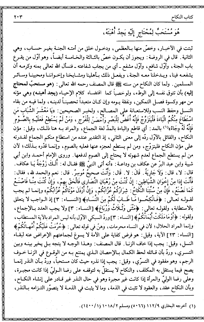 وَلَمَّا كَانَ النِّكَاحُ مِنْ سُنَّتِهِ - صَلَّى اللَّهُ عَلَيْهِ وَسَلَّمَ - قَالَ الْمُصَنِّفُ - رَحِمَهُ اللَّهُ تَعَالَى -: (هُوَ مُسْتَحَبُّ لِمُحْتَاجٍ إلَيْهِ) بِأَنْ تَتُوقَ نَفْسُهُ إلَى الْوَطْءِ، وَلَوْ خَصِيًّا كَمَا اقْتَضَاهُ كَلَامُ الْإِحْيَاءِ (يَجِدُ أُهْبَتَهُ) وَهِيَ مُؤَنُهُ مِنْ مَهْرٍ وَكِسْوَةِ فَصْلِ التَّمْكِينِ، وَنَفَقَةِ يَوْمِهِ وَإِنْ كَانَ مُتَعَبِّدًا تَحْصِينًا لِدِينِهِ، وَلِمَا فِيهِ مِنْ بَقَاءِ النَّسْلِ وَحِفْظِ النَّسَبِ وَلِلِاسْتِعَانَةِ عَلَى الْمَصَالِحِ، وَلِخَبَرِ الصَّحِيحَيْنِ: «يَا مَعْشَرَ الشَّبَابِ مَنْ اسْتَطَاعَ مِنْكُمْ الْبَاءَةَ فَلْيَتَزَوَّجْ فَإِنَّهُ أَغَضُّ لِلْبَصَرِ وَأَحْصَنُ لِلْفَرْجِ، وَمَنْ لَمْ يَسْتَطِعْ فَعَلَيْهِ بِالصَّوْمِ فَإِنَّهُ لَهُ وِجَاءٌ» بِالْمَدِّ: أَيْ قَاطِعٌ وَالْبَاءَةُ بِالْمَدِّ لُغَةً الْجِمَاعُ، وَالْمُرَادُ بِهِ هُنَا ذَلِكَ، وَقِيلَ: مُؤَنُ النِّكَاحِ، وَالْقَائِلُ بِالْأَوَّلِ رَدَّهُ إلَى مَعْنَى الثَّانِي؛ إذْ التَّقْدِيرُ عِنْدَهُ مَنْ اسْتَطَاعَ مِنْكُمْ الْجِمَاعَ لِقُدْرَتِهِ عَلَى مُؤَنِ النِّكَاحِ فَلْيَتَزَوَّجْ، وَمَنْ لَمْ يَسْتَطِعْ لِعَجْزِهِ عَنْهَا فَعَلَيْهِ بِالصَّوْمِ، وَإِنَّمَا قَدَّرَهُ بِذَلِكَ؛ لِأَنَّ مَنْ لَمْ يَسْتَطِعْ الْجِمَاعَ لِعَدَمِ شَهْوَتِهِ لَا يَحْتَاجُ إلَى الصَّوْمِ لِدَفْعِهَا. وَرَوَى الْإِمَامُ أَحْمَدُ وَابْنُ أَبِي شَيْبَةَ وَابْنُ عَبْدِ الْبَرِّ عَنْ عَكَّافِ بْنِ وَدَاعَةَ: أَنَّهُ «أَتَى النَّبِيَّ - صَلَّى اللَّهُ عَلَيْهِ وَسَلَّمَ - فَقَالَ لَهُ: أَلَكَ زَوْجَةٌ يَا عَكَّافُ. قَالَ: لَا، قَالَ: وَلَا جَارِيَةٌ. قَالَ: لَا. قَالَ: وَأَنْتَ صَحِيحٌ مُوسِرٌ. قَالَ: نَعَمْ وَالْحَمْدُ لِلَّهِ، فَقَالَ: فَأَنْتَ إذًا مِنْ إخْوَانِ الشَّيَاطِينِ: إنْ كُنْتَ مِنْ رُهْبَانِ النَّصَارَى فَالْحَقْ بِهِمْ، وَإِنْ كُنْتَ مِنَّا فَاصْنَعْ كَمَا نَصْنَعُ، فَإِنَّ مِنْ سُنَّتِنَا النِّكَاحَ: شِرَارُكُمْ عُزَّابُكُمْ، وَإِنَّ أَرْذَلَ مَوْتَاكُمْ عُزَّابُكُمْ» وَإِنَّمَا لَمْ يَجِبْ لِقَوْلِهِ تَعَالَى: {فَانْكِحُوا مَا طَابَ لَكُمْ مِنَ النِّسَاءِ} [النساء: 3] ؛ إذْ الْوَاجِبُ لَا يَتَعَلَّقُ بِالِاسْتِطَابَةِ، وَلِقَوْلِهِ - تَعَالَى -: {مَثْنَى وَثُلاثَ وَرُبَاعَ} [النساء: 3] وَلَا يَجِبُ الْعَدَدُ بِالْإِجْمَاعِ، وَلِقَوْلِهِ: {أَوْ مَا مَلَكَتْ أَيْمَانُكُمْ} [النساء: 3] وَرَدَّ السُّبْكِيُّ الْأَوَّلَ بِأَنَّهُ لَيْسَ الْمُرَادُ بِالْآيَةِ الْمُسْتَطَابَ، وَإِنَّمَا الْمُرَادُ الْحَلَالُ؛ لِأَنَّ فِي النِّسَاءِ مُحَرَّمَاتٌ، وَهُنَّ فِي قَوْله تَعَالَى: {حُرِّمَتْ عَلَيْكُمْ أُمَّهَاتُكُمْ} [النساء: 23] الْآيَةَ، وَقِيلَ: هُوَ فَرْضُ كِفَايَةٍ عَلَى الْأُمَّةِ لَا يَسُوغُ لِجَمَاعَتِهِمْ الْإِعْرَاضُ عَنْهُ لِبَقَاءِ النَّسْلِ، وَقِيلَ: يَجِبُ إذَا خَافَ الزِّنَا.