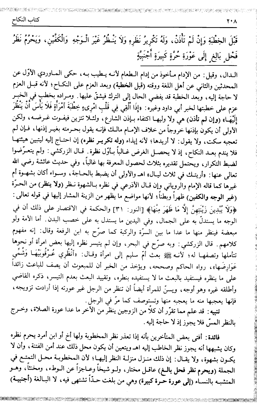 ـــــــــــــــــــــــــــــQالدَّالِ، وَقِيلَ: مِنْ الْإِدَامِ مَأْخُوذٌ مِنْ إدَامِ الطَّعَامِ لِأَنَّهُ يُطَيَّبُ بِهِ، حَكَى الْمَاوَرْدِيُّ الْأَوَّلَ عَنْ الْمُحَدِّثِينَ وَالثَّانِي عَنْ أَهْلِ اللُّغَةِ وَوَقْتُهُ (قَبْلَ الْخِطْبَةِ) وَبَعْدَ الْعَزْمِ عَلَى النِّكَاحِ؛ لِأَنَّهُ قَبْلَ الْعَزْمِ لَا حَاجَةَ إلَيْهِ، وَبَعْدَ الْخِطْبَةِ قَدْ يُفْضِي الْحَالُ إلَى التَّرْكِ فَيَشُقَّ عَلَيْهَا. وَمُرَادُهُ بِخَطَبَ فِي الْخَبَرِ عَزَمَ عَلَى خِطْبَتِهَا لِخَبَرِ أَبِي دَاوُد وَغَيْرِهِ: «إذَا أُلْقِيَ فِي قَلْبِ امْرِئٍ خِطْبَةُ امْرَأَةٍ فَلَا بَأْسَ أَنْ يَنْظُرَ إلَيْهَا» (وَإِنْ لَمْ تَأْذَنْ) هِيَ وَلَا وَلِيُّهَا اكْتِفَاءً بِإِذْنِ الشَّارِعِ، وَلِئَلَّا تَتَزَيَّنَ فَيَفُوتَ غَرَضُهُ، وَلَكِنَّ الْأَوْلَى أَنْ يَكُونَ بِإِذْنِهَا خُرُوجًا مِنْ خِلَافِ الْإِمَامِ مَالِكٍ فَإِنَّهُ يَقُولُ بِحُرْمَتِهِ بِغَيْرِ إذْنِهَا، فَإِنْ لَمْ تُعْجِبْهُ سَكَتَ، وَلَا يَقُولُ: لَا أُرِيدُهَا؛ لِأَنَّهُ إيذَاءٌ (وَلَهُ تَكْرِيرُ نَظَرِهِ) إنْ احْتَاجَ إلَيْهِ لِيَتَبَيَّنَ هَيْئَتَهَا فَلَا يَنْدَمَ بَعْدَ النِّكَاحِ؛ إذْ لَا يَحْصُلُ الْغَرَضُ غَالِبًا بِأَوَّلِ نَظْرَةٍ. قَالَ الزَّرْكَشِيُّ: وَلَمْ يَتَعَرَّضُوا لِضَبْطِ التَّكْرَارِ، وَيُحْتَمَلُ تَقْدِيرُهُ بِثَلَاثٍ لِحُصُولِ الْمَعْرِفَةِ بِهَا غَالِبًا، وَفِي حَدِيثِ عَائِشَةَ - رَضِيَ اللَّهُ تَعَالَى عَنْهَا -: «أُرِيتُك فِي ثَلَاثِ لَيَالٍ» . اهـ.