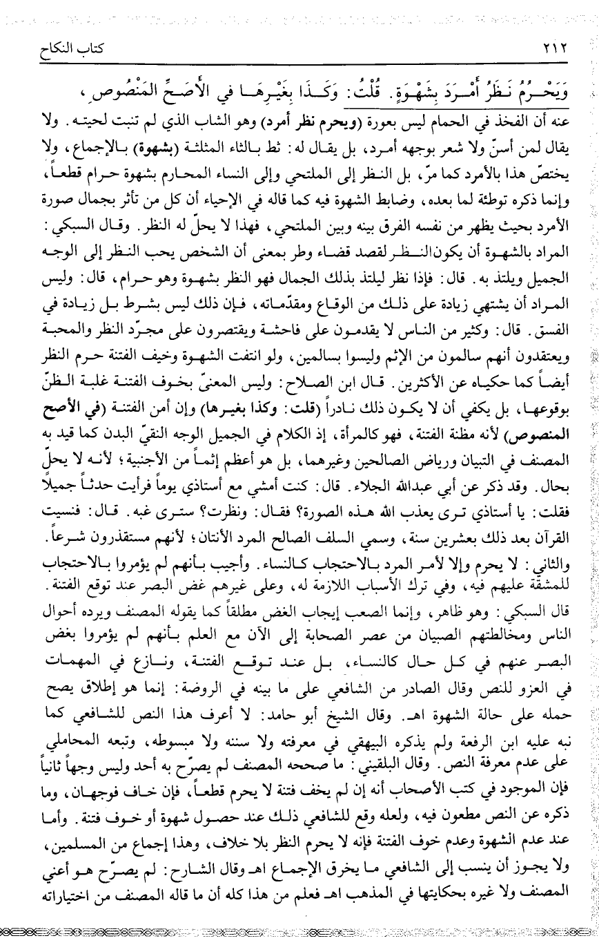 وَقَالَ الشَّيْخُ أَبُو حَامِدٍ: لَا أَعْرِفُ هَذَا النَّصَّ لِلشَّافِعِيِّ كَمَا نَبَّهَ عَلَيْهِ ابْنُ الرِّفْعَةِ وَلَمْ يَذْكُرْهُ الْبَيْهَقِيُّ فِي مَعْرِفَتِهِ وَلَا سُنَنِهِ وَلَا مَبْسُوطِهِ، وَتَبِعَهُ الْمَحَامِلِيُّ عَلَى عَدَمِ مَعْرِفَةِ النَّصِّ. وَقَالَ الْبُلْقِينِيُّ: مَا صَحَّحَهُ الْمُصَنِّفُ لَمْ يُصَرِّحْ بِهِ أَحَدٌ وَلَيْسَ وَجْهًا ثَانِيًا فَإِنَّ الْمَوْجُودَ فِي كُتُبِ الْأَصْحَابِ أَنَّهُ إنْ لَمْ يَخَفْ فِتْنَةً لَا يَحْرُمُ قَطْعًا، فَإِنْ خَافَ فَوَجْهَانِ، وَمَا ذَكَرَهُ عَنْ النَّصِّ مَطْعُونٌ فِيهِ، وَلَعَلَّهُ وَقَعَ لِلشَّافِعِيِّ ذَلِكَ عِنْدَ حُصُولِ شَهْوَةٍ أَوْ خَوْفِ فِتْنَةٍ. وَأَمَّا عِنْدَ عَدَمِ الشَّهْوَةِ وَعَدَمِ خَوْفِ الْفِتْنَةِ فَإِنَّهُ لَا يَحْرُمُ النَّظَرُ بِلَا خِلَافٍ، وَهَذَا إجْمَاعُ مِنْ الْمُسْلِمِينَ، وَلَا يَجُوزُ أَنْ يُنْسَبَ إلَى الشَّافِعِيِّ مَا يَخْرِقُ الْإِجْمَاعَ. اهـ.