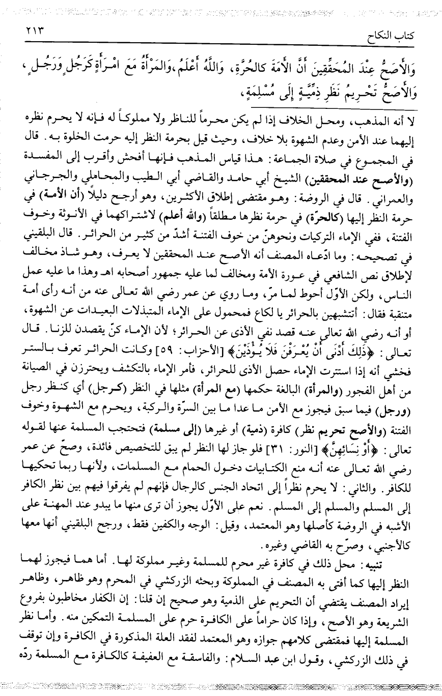 (وَالْأَصَحُّ عِنْدَ الْمُحَقِّقِينَ) الشَّيْخِ أَبِي حَامِدٍ وَالْقَاضِي أَبِي الطَّيِّبِ وَالْمَحَامِلِيِّ وَالْجُرْجَانِيِّ وَالْعِمْرَانِيِّ. قَالَ فِي الرَّوْضَةِ: وَهُوَ مُقْتَضَى إطْلَاقُ الْأَكْثَرِينَ، وَهُوَ أَرْجَحُ دَلِيلًا (أَنَّ الْأَمَةَ) فِي حُرْمَةِ النَّظَرِ إلَيْهَا (كَالْحُرَّةِ) فِي حُرْمَةِ نَظَرِهَا مُطْلَقًا (وَاَللَّهُ أَعْلَمُ) لِاشْتِرَاكِهِمَا فِي الْأُنُوثَةِ وَخَوْفِ الْفِتْنَةِ، فَفِي الْإِمَاءِ التُّرْكِيَّاتِ وَنَحْوِهِنَّ مِنْ خَوْفِ الْفِتْنَةِ أَشَدُّ مِنْ كَثِيرٍ مِنْ الْحَرَائِرِ. قَالَ الْبُلْقِينِيُّ فِي تَصْحِيحِهِ: وَمَا ادَّعَاهُ الْمُصَنِّفُ أَنَّهُ الْأَصَحُّ عِنْدَ الْمُحَقِّقِينَ لَا يُعْرَفُ، وَهُوَ شَاذٌّ مُخَالِفٌ لِإِطْلَاقِ نَصِّ الشَّافِعِيِّ فِي عَوْرَةِ الْأَمَةِ وَمُخَالِفٌ لِمَا عَلَيْهِ جُمْهُورُ أَصْحَابِهِ اهـ.