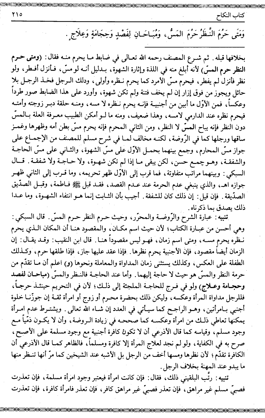 تَنْبِيهٌ عِبَارَةُ الشَّرْحِ وَالرَّوْضَةِ وَالْمُحَرَّرِ، وَحَيْثُ حَرُمَ النَّظَرُ حَرُمَ الْمَسُّ. قَالَ السُّبْكِيُّ: وَهِيَ أَحْسَنُ مِنْ عِبَارَةِ الْكِتَابِ؛ لِأَنَّ حَيْثُ اسْمَ مَكَان، وَالْمَقْصُودُ هُنَا أَنَّ الْمَكَانَ الَّذِي يَحْرُمُ نَظَرُهُ يَحْرُمُ مَسُّهُ، وَمَتَى اسْمُ زَمَانٍ، فَهُوَ لَيْسَ مَقْصُودًا هُنَا. قَالَ ابْنُ النَّقِيبِ: وَقَدْ يُقَالُ: إنَّ الزَّمَانَ أَيْضًا مَقْصُودٌ، فَإِنَّ الْأَجْنَبِيَّةَ يَحْرُمُ نَظَرُهَا. فَإِذَا عَقَدَ عَلَيْهَا جَازَ، فَإِذَا طَلَّقَهَا حَرُمَ، وَكَذَلِكَ الطِّفْلَةُ عَلَى الْعَكْسِ، وَكَذَلِكَ يُسْتَثْنَى زَمَانُ الْمُدَاوَاةِ وَالْمُعَامَلَةِ وَنَحْوَهَا.