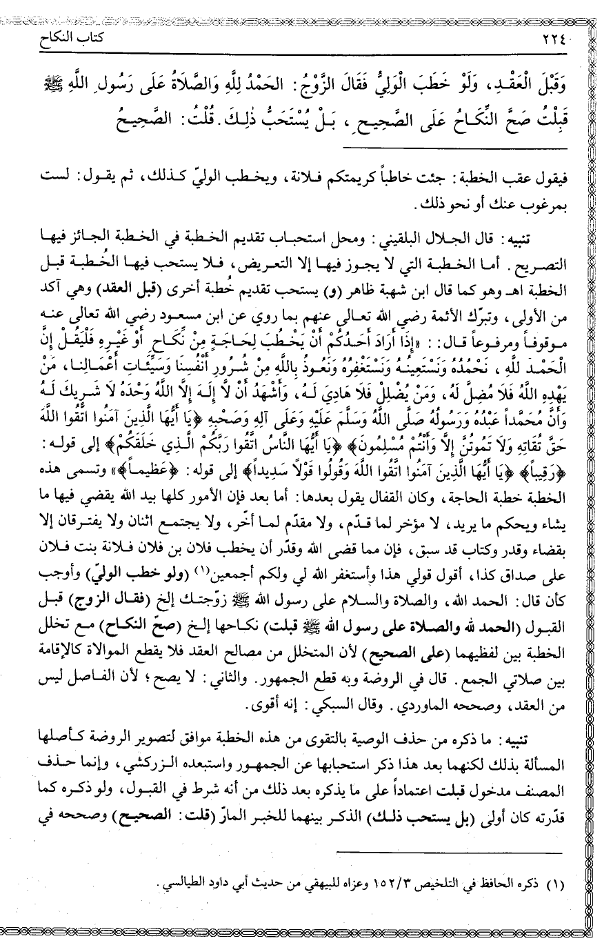 تَنْبِيهٌ: مَا ذَكَرَهُ مِنْ حَذْفِ الْوَصِيَّةِ بِالتَّقْوَى مِنْ هَذِهِ الْخُطْبَةِ مُوَافِقٌ لِتَصْوِيرِ الرَّوْضَةِ كَأَصْلِهَا الْمَسْأَلَةَ بِذَلِكَ لَكِنَّهُمَا بَعْدَ هَذَا ذَكَرَا اسْتِحْبَابَهَا عَنْ الْجُمْهُورِ وَاسْتَبْعَدَهُ الزَّرْكَشِيُّ، وَإِنَّمَا حَذَفَ الْمُصَنِّفُ مَدْخُولَ قَبِلْتُ اعْتِمَادًا عَلَى مَا يَذْكُرُهُ بَعْدَ ذَلِكَ مِنْ أَنَّهُ شَرْطٌ فِي الْقَبُولِ، وَلَوْ ذَكَرَهُ كَمَا قَدَّرْتُهُ كَانَ أَوْلَى (بَلْ يُسْتَحَبُّ ذَلِكَ) الذِّكْرُ بَيْنَهُمَا لِلْخَبَرِ الْمَارِّ (قُلْتُ: الصَّحِيحُ) وَصَحَّحَهُ فِي