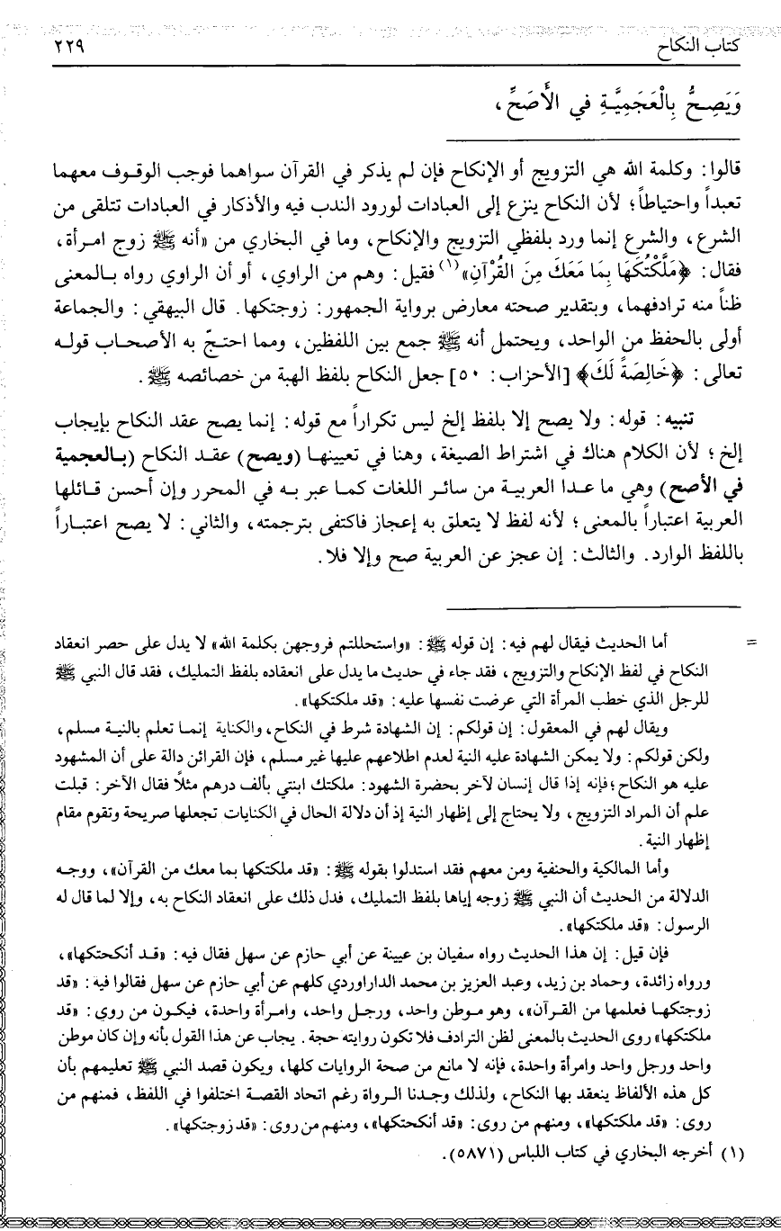 (وَيَصِحُّ) عَقْدُ النِّكَاحِ (بِالْعَجَمِيَّةِ فِي الْأَصَحِّ) وَهِيَ مَا عَدَا الْعَرَبِيَّةَ مِنْ سَائِرِ اللُّغَاتِ كَمَا عَبَّرَ بِهِ فِي الْمُحَرَّرِ وَإِنْ أَحْسَنَ قَائِلُهَا الْعَرَبِيَّةَ اعْتِبَارًا بِالْمَعْنَى؛ لِأَنَّهُ لَفْظٌ لَا يَتَعَلَّقُ بِهِ إعْجَازٌ فَاكْتُفِيَ بِتَرْجَمَتِهِ، وَالثَّانِي: لَا يَصِحُّ اعْتِبَارًا بِاللَّفْظِ الْوَارِدِ. وَالثَّالِثُ: إنْ عَجَزَ عَنْ الْعَرَبِيَّةِ صَحَّ وَإِلَّا فَلَا.