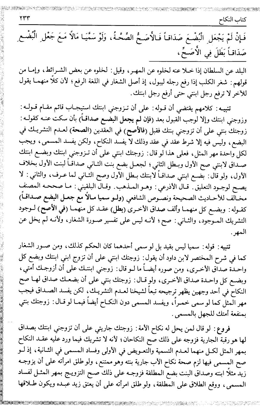 تَنْبِيهٌ: قَوْلُهُ: سَمَّيَا لَيْسَ بِقَيْدٍ بَلْ لَوْ سَمَّى أَحَدُهُمَا كَانَ الْحُكْمُ كَذَلِكَ، وَمِنْ صُوَرِ الشِّغَارِ كَمَا فِي شَرْحِ الْمُخْتَصَرِ لِابْنِ دَاوُد أَنْ يَقُولَ: زَوَّجْتُكَ ابْنَتِي عَلَى أَنْ تُزَوِّجَ ابْنِي ابْنَتَكَ وَبُضْعُ كُلِّ وَاحِدَةٍ صَدَاقُ الْأُخْرَى، وَمِنْ صُوَرِهِ أَيْضًا مَا لَوْ قَالَ: زَوِّجْنِي ابْنَتَك عَلَى أَنْ أُزَوِّجَك أَمَتِي، وَبُضْعُ كُلِّ وَاحِدَةٍ صَدَاقُ الْأُخْرَى، وَلَوْ قَالَ: زَوَّجْتُكَ بِنْتِي عَلَى أَنَّ بُضْعَكَ صَدَاقٌ لَهَا صَحَّ النِّكَاحُ فِي أَحَدِ وَجْهَيْنِ يَظْهَرُ تَرْجِيحُهُ تَبَعًا لِشَيْخِنَا لِعَدَمِ التَّشْرِيكِ، لَكِنْ يَفْسُدُ الصَّدَاقُ فَيَجِبُ مَهْرُ الْمِثْلِ كَمَا لَوْ سَمَّى خَمْرًا، وَيَفْسُدُ الْمُسَمَّى دُونَ النِّكَاحِ أَيْضًا فِيمَا لَوْ قَالَ: زَوَّجْتُكَ بِنْتِي بِمَنْفَعَةِ أَمَتِكَ لِلْجَهْلِ بِالْمُسَمَّى.