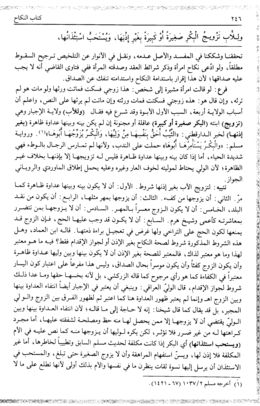 تَنْبِيهٌ: لِتَزْوِيجِ الْأَبِ بِغَيْرِ إذْنِهَا شُرُوطٌ. الْأَوَّلُ: أَنْ لَا يَكُونَ بَيْنَهُ وَبَيْنَهَا عَدَاوَةٌ ظَاهِرَةٌ كَمَا مَرَّ. الثَّانِي: أَنْ يُزَوِّجَهَا مِنْ كُفْءٍ. الثَّالِثُ: أَنْ يُزَوِّجَهَا بِمَهْرِ مِثْلِهَا، الرَّابِعُ: أَنْ يَكُونَ مِنْ نَقْدِ الْبَلَدِ، الْخَامِسُ: أَنْ لَا يَكُونَ الزَّوْجُ مُعْسِرًا بِالْمَهْرِ. السَّادِسُ: أَنْ لَا يُزَوِّجَهَا بِمَنْ تَتَضَرَّرُ بِمُعَاشَرَتِهِ كَأَعْمَى وَشَيْخٍ هَرِمٍ. السَّابِعُ: أَنْ لَا يَكُونَ قَدْ وَجَبَ عَلَيْهَا الْحَجُّ، فَإِنَّ الزَّوْجَ قَدْ يَمْنَعُهَا لِكَوْنِ الْحَجِّ عَلَى التَّرَاخِي وَلَهَا غَرَضٌ فِي تَعْجِيلِ بَرَاءَةِ ذِمَّتِهَا. قَالَهُ ابْنُ الْعِمَادِ، وَهَلْ هَذِهِ الشُّرُوطُ الْمَذْكُورَةُ شُرُوطٌ لِصِحَّةِ النِّكَاحِ بِغَيْرِ الْإِذْنِ أَوْ لِجَوَازِ الْإِقْدَامِ فَقَطْ؟ فِيهِ مَا هُوَ مُعْتَبَرٌ لِهَذَا وَمَا هُوَ مُعْتَبَرٌ لِذَاكَ، فَالْمُعْتَبَرُ لِلصِّحَّةِ بِغَيْرِ الْإِذْنِ أَنْ لَا يَكُونَ بَيْنَهَا وَبَيْنَ وَلِيِّهَا عَدَاوَةٌ ظَاهِرَةٌ وَأَنْ يَكُونَ الزَّوْجُ كُفْئًا وَأَنْ يَكُونَ مُوسِرًا بِحَالِ الصَّدَاقِ، وَلَيْسَ هَذَا مُفَرَّعًا عَلَى اعْتِبَارِ كَوْنِ الْيَسَارِ مُعْتَبَرًا فِي الْكَفَاءَةِ كَمَا هُوَ رَأْيٌ مَرْجُوحٌ كَمَا قَالَهُ الزَّرْكَشِيُّ، بَلْ لِأَنَّهُ بَخَسَهَا حَقَّهَا وَمَا عَدَا ذَلِكَ شُرُوطٌ لِجَوَازِ الْإِقْدَامِ، قَالَ الْوَلِيُّ الْعِرَاقِيُّ: وَيَنْبَغِي أَنْ يُعْتَبَرَ فِي الْإِجْبَارِ أَيْضًا انْتِفَاءُ الْعَدَاوَةِ بَيْنَهَا وَبَيْنَ الزَّوْجِ. اهـ.