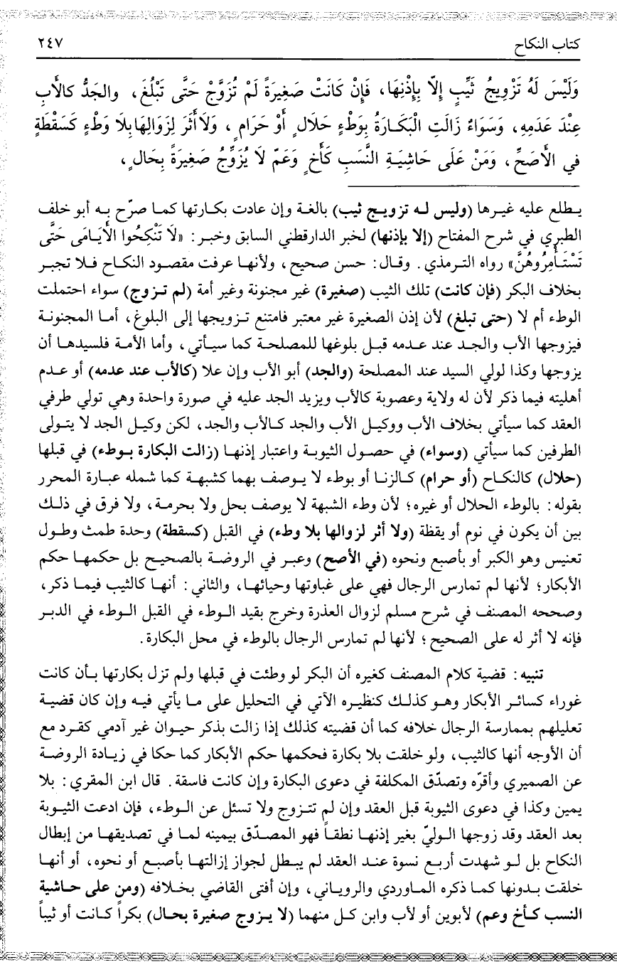 تَنْبِيهٌ: قَضِيَّةُ كَلَامِ الْمُصَنِّفِ كَغَيْرِهِ أَنَّ الْبِكْرَ لَوْ وُطِئَتْ فِي قُبُلِهَا وَلَمْ تَزُلْ بَكَارَتُهَا بِأَنْ كَانَتْ غَوْرَاءَ كَسَائِرِ الْأَبْكَارِ وَهُوَ كَذَلِكَ كَنَظِيرِهِ الْآتِي فِي التَّحْلِيلِ عَلَى مَا يَأْتِي فِيهِ وَإِنْ كَانَ قَضِيَّةُ تَعْلِيلِهِمْ بِمُمَارَسَةِ الرِّجَالِ خِلَافَهُ كَمَا أَنَّ قَضِيَّتَهُ كَذَلِكَ إذَا زَالَتْ بِذَكَرِ حَيَوَانٍ غَيْرِ آدَمِيٍّ كَقِرْدٍ مَعَ أَنَّ الْأَوْجَهَ أَنَّهَا كَالثَّيِّبِ، وَلَوْ خُلِقَتْ بِلَا بَكَارَةٍ فَحُكْمُهَا حُكْمُ الْأَبْكَارِ كَمَا حَكَى فِي زِيَادَةِ الرَّوْضَةِ عَنْ الصَّيْمَرِيِّ وَأَقَرَّهُ وَتُصَدَّقُ الْمُكَلَّفَةُ فِي دَعْوَى الْبَكَارَةِ وَإِنْ كَانَتْ فَاسِقَةً. قَالَ ابْنُ الْمُقْرِي: بِلَا يَمِينٍ وَكَذَا فِي دَعْوَى الثُّيُوبَةِ قَبْلَ الْعَقْدِ وَإِنْ لَمْ تَتَزَوَّجْ وَلَا تُسْأَلُ عَنْ الْوَطْءِ، فَإِنْ ادَّعَتْ الثُّيُوبَةَ بَعْدَ الْعَقْدِ وَقَدْ زَوَّجَهَا الْوَلِيُّ بِغَيْرِ إذْنِهَا نُطْقًا فَهُوَ الْمُصَدَّقُ بِيَمِينِهِ لِمَا فِي تَصْدِيقِهَا مِنْ إبْطَالِ النِّكَاحِ بَلْ لَوْ شَهِدَتْ أَرْبَعُ نِسْوَةٍ عِنْدَ الْعَقْدِ لَمْ يَبْطُلْ لِجَوَازِ إزَالَتِهَا بِأُصْبُعٍ أَوْ نَحْوِهِ، أَوْ أَنَّهَا خُلِقَتْ بِدُونِهَا كَمَا ذَكَرَهُ الْمَاوَرْدِيُّ وَالرُّويَانِيُّ، وَإِنْ أَفْتَى الْقَاضِي بِخِلَافِهِ (وَمَنْ عَلَى حَاشِيَةِ النَّسَبِ كَأَخٍ وَعَمٍّ) لِأَبَوَيْنِ أَوْ لِأَبٍ وَابْنِ كُلٍّ مِنْهُمَا (لَا يُزَوِّجُ صَغِيرَةً بِحَالٍ) بِكْرًا كَانَتْ أَوْ ثَيِّبًا
