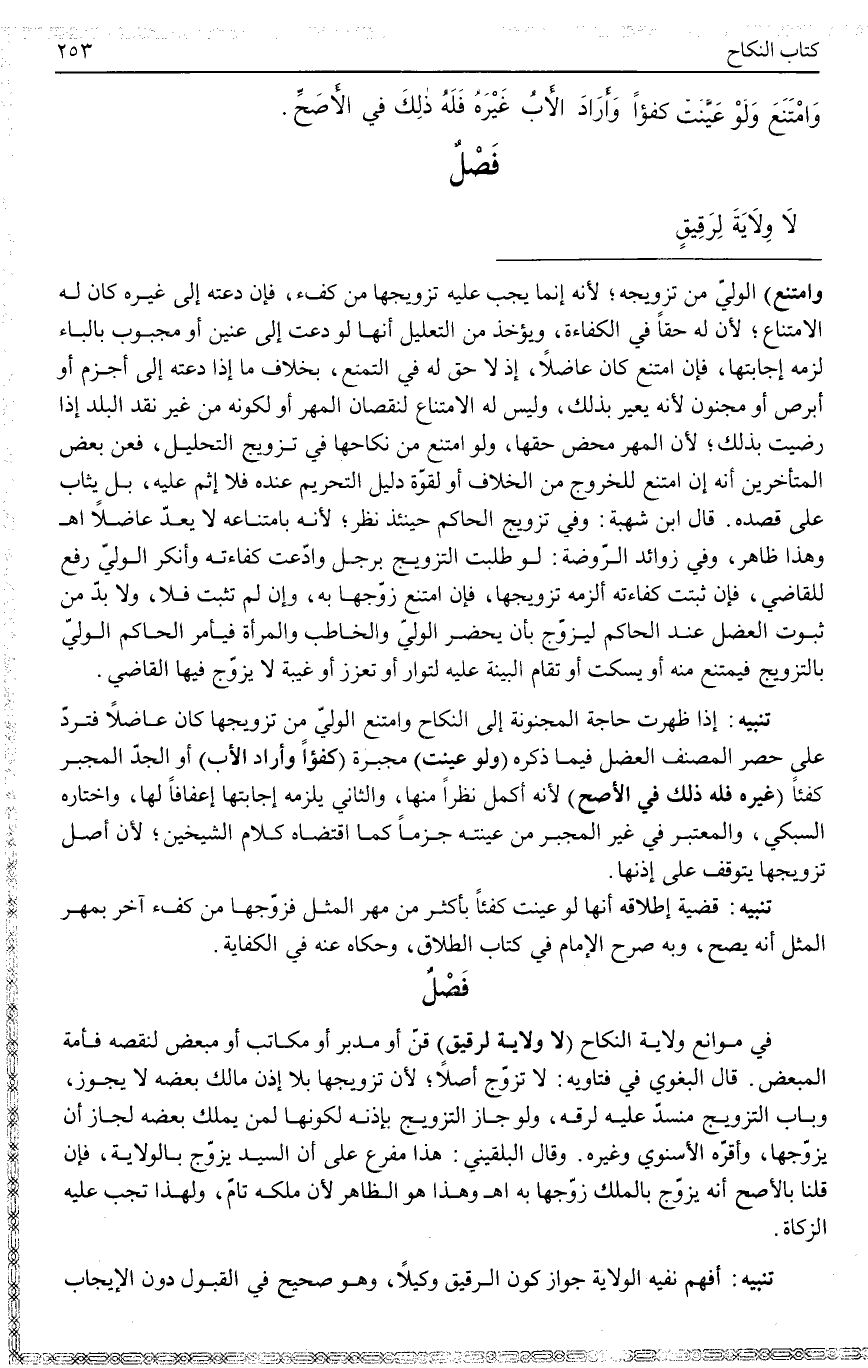 فَصْلٌ فِي مَوَانِعِ وِلَايَةِ النِّكَاحِ (لَا وِلَايَةَ لِرَقِيقٍ) قِنٍّ أَوْ مُدَبَّرٍ أَوْ مُكَاتَبٍ أَوْ مُبَعَّضٍ لِنَقْصِهِ فَأَمَةُ الْمُبَعَّضِ قَالَ الْبَغَوِيّ فِي فَتَاوِيهِ: لَا تُزَوَّجُ أَصْلًا؛ لِأَنَّ تَزْوِيجَهَا بِلَا إذْنِ مَالِكِ بَعْضِهِ لَا يَجُوزُ، وَبَابُ التَّزْوِيجِ مُنْسَدٌّ عَلَيْهِ لِرِقِّهِ، وَلَوْ جَازَ التَّزْوِيجُ بِإِذْنِهِ لِكَوْنِهَا لِمَنْ يَمْلِكُ بَعْضَهُ لَجَازَ أَنْ يُزَوِّجَهَا، وَأَقَرَّهُ الْإِسْنَوِيُّ وَغَيْرُهُ. وَقَالَ الْبُلْقِينِيُّ: هَذَا مُفَرَّعٌ عَلَى أَنَّ السَّيِّدَ يُزَوِّجُ بِالْوِلَايَةِ، فَإِنْ قُلْنَا بِالْأَصَحِّ إنَّهُ يُزَوِّجُ بِالْمِلْكِ زَوَّجَهَا بِهِ. اهـ.