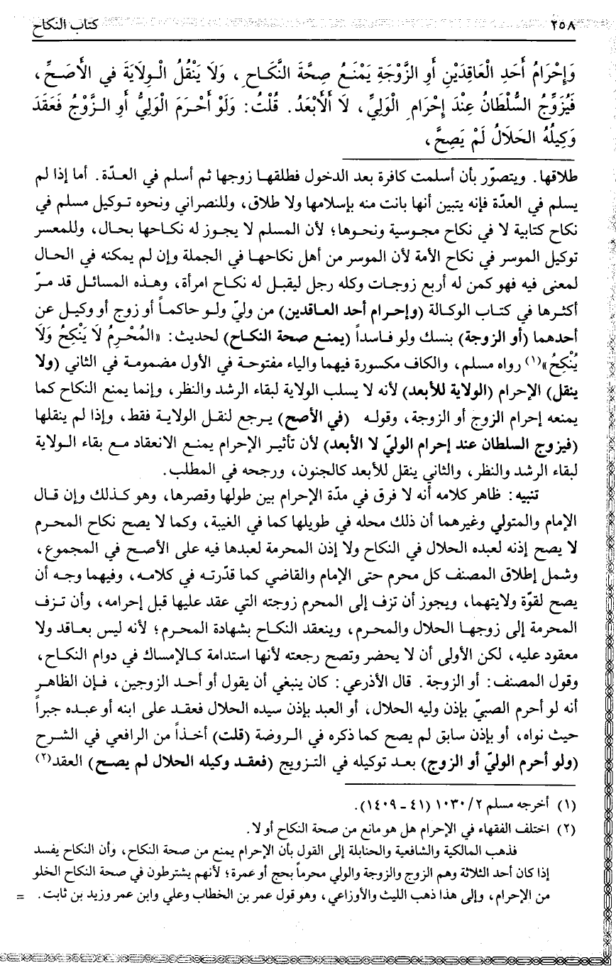 (وَإِحْرَامُ أَحَدِ الْعَاقِدَيْنِ) مَنْ وُلِّيَ وَلَوْ حَاكِمًا أَوْ زَوْجٌ أَوْ وَكِيلٌ عَنْ أَحَدِهِمَا (أَوْ الزَّوْجَةِ) بِنُسُكٍ وَلَوْ فَاسِدًا (يَمْنَعُ صِحَّةَ النِّكَاحِ) لِحَدِيثِ: «الْمُحْرِمُ لَا يَنْكِحُ وَلَا يُنْكِحُ» رَوَاهُ مُسْلِمٌ، وَالْكَافُ مَكْسُورَةٌ فِيهِمَا وَالْيَاءُ مَفْتُوحَةٌ فِي الْأَوَّلِ مَضْمُومَةً فِي الثَّانِي (وَلَا يَنْقُلُ) الْإِحْرَامُ (الْوِلَايَةَ لِلْأَبْعَدِ) لِأَنَّهُ لَا يَسْلُبُ الْوِلَايَةَ لِبَقَاءِ الرُّشْدِ وَالنَّظَرِ، وَإِنَّمَا يَمْنَعُ النِّكَاحَ كَمَا يَمْنَعُهُ إحْرَامُ الزَّوْجِ أَوْ الزَّوْجَةِ، وَقَوْلُهُ (فِي الْأَصَحِّ) يَرْجِعُ لِنَقْلِ الْوِلَايَةِ فَقَطْ، وَإِذَا لَمْ يَنْقُلْهَا (فَيُزَوِّجُ السُّلْطَانُ عِنْدَ إحْرَامِ الْوَلِيِّ لَا الْأَبْعَدُ) لِأَنَّ تَأْثِيرَ الْإِحْرَامِ يَمْنَعُ الِانْعِقَادَ مَعَ بَقَاءِ الْوِلَايَةِ لِبَقَاءِ الرُّشْدِ وَالنَّظَرِ، وَالثَّانِي يَنْقُلُ لِلْأَبْعَدِ كَالْجُنُونِ، وَرَجَّحَهُ فِي الْمَطْلَبِ.