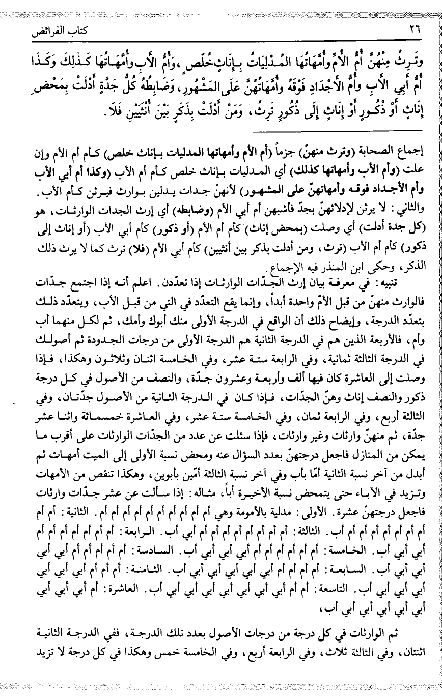 اعْلَمْ أَنَّهُ إذَا اجْتَمَعَ جَدَّاتٌ فَالْوَارِثُ مِنْهُنَّ مِنْ قِبَلِ الْأُمِّ وَاحِدَةٌ أَبَدًا، وَإِنَّمَا يَقَعُ التَّعَدُّدُ فِي الَّتِي مِنْ قِبَلِ الْأَبِ، وَيَتَعَدَّدُ ذَلِكَ بِتَعَدُّدِ الدَّرَجَةِ، وَإِيضَاحُ ذَلِكَ أَنَّ الْوَاقِعَ فِي الدَّرَجَةِ الْأُولَى مِنْكَ أَبُوكَ وَأُمُّكَ، ثُمَّ لِكُلٍّ مِنْهُمَا أَبٌ وَأُمٌّ، فَالْأَرْبَعَةُ الَّذِينَ هُمْ فِي الدَّرَجَةِ الثَّانِيَةِ هُمْ الدَّرَجَةُ الْأُولَى مِنْ دَرَجَاتِ الْجُدُودَةِ ثُمَّ أُصُولُك فِي الدَّرَجَةِ الثَّالِثَةِ ثَمَانِيَةٌ، وَفِي الرَّابِعَةِ سِتَّةَ عَشَرَ، وَفِي الْخَامِسَةِ اثْنَانِ وَثَلَاثُونَ وَهَكَذَا، فَإِذَا وَصَلْت إلَى الْعَاشِرَةِ كَانَ فِيهَا أَلْفٌ وَأَرْبَعَةٌ وَعِشْرُونَ جَدَّةً، وَالنِّصْفُ مِنْ الْأُصُولِ فِي كُلِّ دَرَجَةٍ ذُكُورٌ وَالنِّصْفُ إنَاثٌ وَهُنَّ الْجَدَّاتُ، فَإِذَا كَانَ فِي الدَّرَجَةِ الثَّانِيَةِ مِنْ الْأُصُولِ جَدَّتَانِ، وَفِي الثَّالِثَةِ أَرْبَعٌ، وَفِي الرَّابِعَةِ ثَمَانٍ، وَفِي الْخَامِسَةِ سِتَّةَ عَشْرَ، وَفِي الْعَاشِرَةِ خَمْسُمِائَةٍ وَاثْنَا عَشَرَ جَدَّةً، ثُمَّ مِنْهُنَّ وَارِثَاتٌ وَغَيْرُ وَارِثَاتٍ، فَإِذَا سُئِلْتَ عَنْ عَدَدٍ مِنْ الْجَدَّاتِ الْوَارِثَاتِ عَلَى أَقْرَبِ مَا يُمْكِنُ مِنْ الْمَنَازِلِ فَاجْعَلْ دَرَجَتَهُنَّ بِعَدَدِ السُّؤَالِ عَنْهُ، وَمَحْضُ نِسْبَةِ الْأُولَى إلَى الْمَيِّتِ أُمَّهَاتٌ ثُمَّ أَبْدِلْ مِنْ آخِرِ نِسْبَةِ الثَّانِيَةِ أُمًّا بِأَبٍ وَفِي آخِرِ نِسْبَةِ الثَّالِثَةِ أُمَّيْنِ بِأَبَوَيْنِ، وَهَكَذَا تَنْقُصُ مِنْ الْأُمَّهَاتِ وَتَزِيدُ فِي الْآبَاءِ حَتَّى يَتَمَحَّضَ نِسْبَةُ الْأَخِيرَةِ أَبًا، مِثَالُهُ: إذَا سَأَلْتَ عَنْ عَشْرِ جَدَّاتٍ وَارِثَاتٍ فَاجْعَلْ دَرَجَتَهُنَّ عَشَرَةً. الْأُولَى: مُدْلِيَةٌ بِالْأُمُومَةِ، وَهِيَ أُمُّ أُمِّ أُمِّ أُمِّ أُمِّ أُمِّ أُمِّ أُمِّ أُمِّ أُمٍّ. الثَّانِيَةُ: أُمُّ أُمِّ أُمِّ أُمِّ أُمِّ أُمِّ أُمِّ أُمِّ أُمِّ أَبٍ. الثَّالِثَةُ: أُمُّ أُمِّ أُمِّ أُمِّ أُمِّ أُمِّ أُمِّ أُمِّ أَبِي أَبٍ. الرَّابِعَةُ: أُمُّ أُمِّ أُمِّ أُمِّ أُمِّ أُمِّ أُمِّ أَبِي أَبِي أَبٍ. الْخَامِسَةُ: أُمُّ أُمِّ أُمِّ أُمِّ أُمِّ أُمِّ أَبِي أَبِي أَبِي أَبٍ. السَّادِسَةُ: أُمُّ أُمِّ أُمِّ أُمِّ أُمِّ أَبِي أَبِي أَبِي أَبِي أَبٍ. السَّابِعَةُ: أُمُّ أُمِّ أُمِّ أُمِّ أَبِي أَبِي أَبِي أَبِي أَبِي أَبٍ. الثَّامِنَةُ: أُمُّ أُمِّ أُمِّ أَبِي أَبِي أَبِي أَبِي أَبِي أَبِي أَبٍ. التَّاسِعَةُ: أُمُّ أُمِّ أَبِي أَبِي أَبِي أَبِي أَبِي أَبِي أَبِي أَبٍ. الْعَاشِرَةُ: أُمُّ أَبِي أَبِي أَبِي أَبِي أَبِي أَبِي أَبِي أَبِي أَبٍ، ثُمَّ الْوَارِثَاتُ فِي كُلِّ دَرَجَةٍ مِنْ دَرَجَاتِ الْأُصُولِ بِعَدَدِ تِلْكَ الدَّرَجَةِ، فَفِي الدَّرَجَةِ الثَّانِيَةِ اثْنَتَانِ، وَفِي الثَّالِثَةِ ثَلَاثٌ، وَفِي الرَّابِعَةِ أَرْبَعٌ، وَفِي الْخَامِسَةِ خَمْسٌ وَهَكَذَا فِي كُلِّ دَرَجَةٍ لَا تَزِيدُ