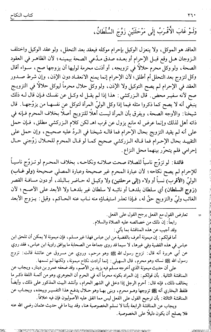 ـــــــــــــــــــــــــــــQالْعَاقِدَ هُوَ الْمُوَكِّلُ، وَلَا يَنْعَزِلُ الْوَكِيلُ بِإِحْرَامِ مُوَكِّلِهِ فَيَعْقِدُ بَعْدَ التَّحَلُّلِ، وَلَوْ عَقَدَ الْوَكِيلُ وَاخْتَلَفَ الزَّوْجَانِ هَلْ وَقَعَ قَبْلَ الْإِحْرَامِ أَوْ بَعْدَهُ صُدِّقَ مُدَّعِي الصِّحَّةِ بِيَمِينِهِ؛ لِأَنَّ الظَّاهِرَ فِي الْعُقُودِ الصِّحَّةُ، وَلَوْ وَكَّلَ مُحْرِمٌ حَلَالًا فِي تَزْوِيجِهِ، أَوْ أَذِنَتْ مُحْرِمَةٌ لِوَلِيِّهَا أَنْ يُزَوِّجَهَا صَحَّ، سَوَاءٌ أَقَالَ وَكِّلْ لِتُزَوَّجَ بَعْدَ التَّحَلُّلِ أَمْ أَطْلَقَ؛ لِأَنَّ الْإِحْرَامَ إنَّمَا يَمْنَعُ الِانْعِقَادَ دُونَ الْإِذْنِ، وَإِنْ شَرَطَ صُدُورَ الْعَقْدِ فِي الْإِحْرَامِ لَمْ يَصِحَّ التَّوْكِيلُ وَلَا الْإِذْنُ، وَلَوْ وَكَّلَ حَلَالٌ مُحْرِمًا لِيُوَكِّلَ حَلَالًا فِي التَّزْوِيجِ صَحَّ لِأَنَّهُ سَفِيرٌ مَحْضٌ. قَالَ الزَّرْكَشِيُّ: هَذَا إذَا لَمْ يَقُلْ لَهُ وَكِّلْ عَنْ نَفْسِك فَإِنْ قَالَ لَهُ ذَلِكَ يَنْبَغِي أَنَّهُ لَا يَصِحُّ كَمَا ذَكَرُوا مِثْلَهُ فِيمَا إذَا وَكَّلَ الْوَلِيُّ الْمَرْأَةَ لِتُوَكِّلَ عَنْ نَفْسِهَا مَنْ يُزَوِّجُهَا. قَالَ شَيْخُنَا: وَالْأَوْجَهُ الصِّحَّةُ، وَيُفَرَّقُ بِأَنَّ الْمَرْأَةَ لَيْسَتْ أَهْلًا لِلتَّزْوِيجِ أَصْلًا بِخِلَافِ الْمُحْرِمِ فَإِنَّهُ فِي ذَاتِهِ أَهْلٌ لِذَلِكَ وَإِنَّمَا عَرَضَ لَهُ مَانِعٌ يَزُولُ عَنْ قُرْبٍ. اهـ. لَكِنَّ كَلَامَ الزَّرْكَشِيّ مُطْلَقٌ، فَإِنْ حُمِلَ عَلَى أَنَّهُ لَمْ يُقَيِّدْ التَّزْوِيجَ بِحَالِ الْإِحْرَامِ فَمَا قَالَهُ شَيْخُنَا فِي الرَّدِّ عَلَيْهِ صَحِيحٌ، وَإِنْ حُمِلَ عَلَى التَّقْيِيدِ بِحَالِ الْإِحْرَامِ فَمَا قَالَهُ الزَّرْكَشِيُّ صَحِيحٌ كَمَا لَوْ قَالَ الْمُحْرِمُ لِلْحَلَالِ زَوِّجْنِي حَالَ إحْرَامِي فَلَمْ يَتَحَرَّرْ بَيْنَهُمَا مَحَلُّ النِّزَاعِ. فَائِدَةٌ: لَوْ تَزَوَّجَ نَاسِيًا لِلصَّلَاةِ صَحَّتْ صَلَاتُهُ وَنِكَاحُهُ، بِخِلَافِ الْمُحْرِمِ لَوْ تَزَوَّجَ نَاسِيًا لِلْإِحْرَامِ لَمْ يَصِحَّ نِكَاحُهُ؛ لِأَنَّ عِبَارَةَ الْمُحْرِمِ غَيْرُ صَحِيحَةٍ وَعِبَارَةَ الْمُصَلِّي صَحِيحَةٌ.