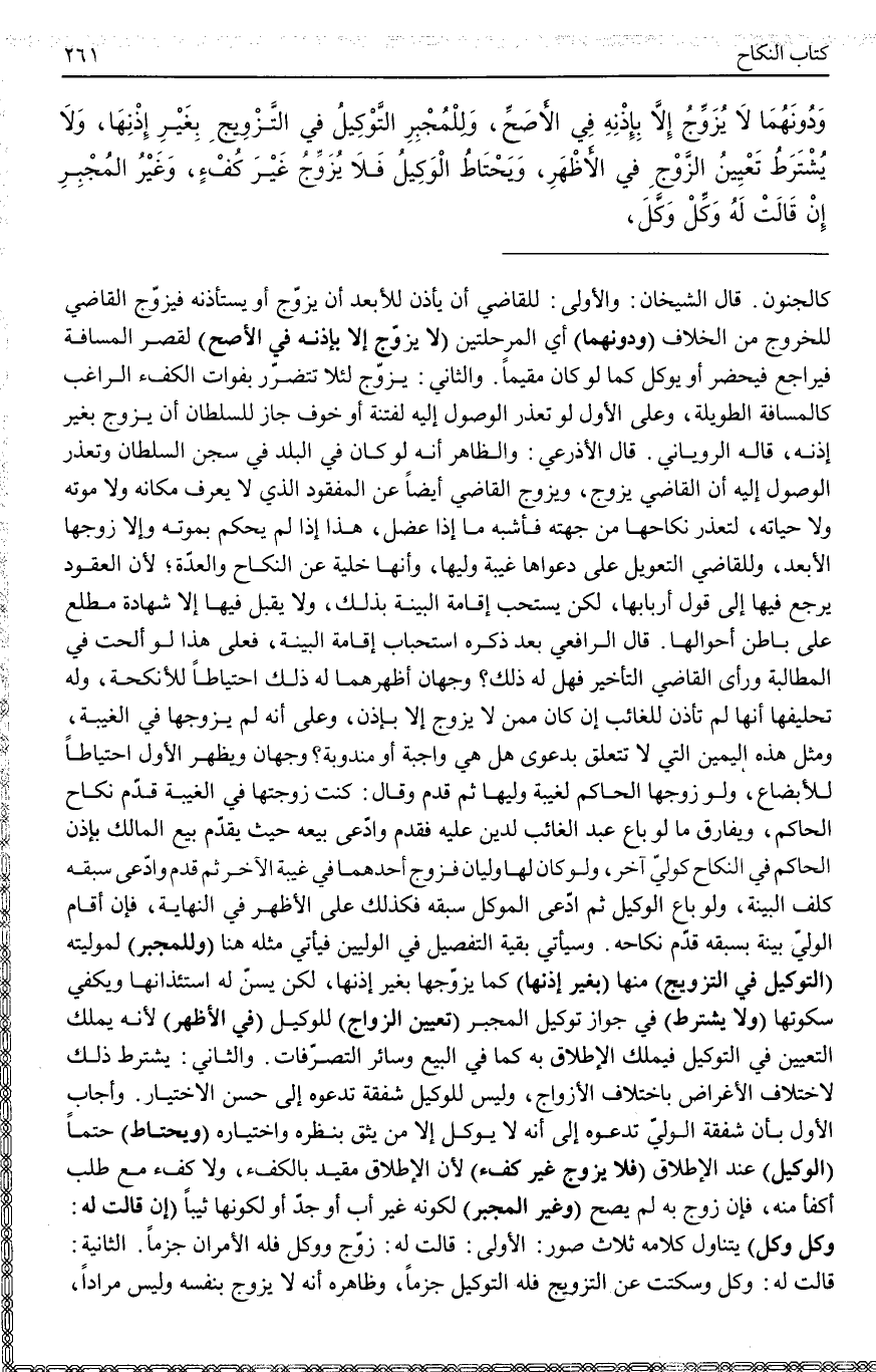 قَالَ الرَّافِعِيُّ بَعْدَ ذِكْرِهِ اسْتِحْبَابَ إقَامَةِ الْبَيِّنَةِ، فَعَلَى هَذَا لَوْ أَلَحَّتْ فِي الْمُطَالَبَةِ وَرَأَى الْقَاضِي التَّأْخِيرَ فَهَلْ لَهُ ذَلِكَ؟ وَجْهَانِ أَظْهَرُهُمَا لَهُ ذَلِكَ احْتِيَاطًا لِلْأَنْكِحَةِ، وَلَهُ تَحْلِيفُهَا أَنَّهَا لَمْ تَأْذَنْ لِلْغَائِبِ إنْ كَانَ مِمَّنْ لَا يُزَوِّجُ إلَّا بِإِذْنٍ، وَعَلَى أَنَّهُ لَمْ يُزَوِّجْهَا فِي الْغَيْبَةِ، وَمِثْلُ هَذِهِ الْيَمِينِ الَّتِي لَا تَتَعَلَّقُ بِدَعْوَى هَلْ هِيَ وَاجِبَةٌ أَوْ مَنْدُوبَةٌ؟ وَجْهَانِ وَيَظْهَرُ الْأَوَّلُ احْتِيَاطًا لِلْأَبْضَاعِ، وَلَوْ زَوَّجَهَا الْحَاكِمُ لِغَيْبَةِ وَلِيِّهِ ثُمَّ قَدِمَ وَقَالَ: كُنْتُ زَوَّجْتُهَا فِي الْغَيْبَةِ قُدِّمَ نِكَاحُ الْحَاكِمِ، وَيُفَارَقُ مَا لَوْ بَاعَ عَبْدَ الْغَائِبِ لِدَيْنٍ عَلَيْهِ فَقَدِمَ وَادَّعَى بَيْعَهُ حَيْثُ يُقَدَّمُ بَيْعُ الْمَالِكِ بِإِذْنِ الْحَاكِمِ فِي النِّكَاحِ كَوَلِيٍّ آخَرَ، وَلَوْ كَانَ لَهَا وَلِيَّانِ فَزَوَّجَ أَحَدُهُمَا فِي غَيْبَةِ الْآخَرِ ثُمَّ قَدِمَ وَادَّعَى سَبْقَهُ كُلِّفَ الْبَيِّنَةَ، وَلَوْ بَاعَ الْوَكِيلُ ثُمَّ ادَّعَى الْمُوَكِّلُ سَبْقَهُ فَكَذَلِكَ عَلَى الْأَظْهَرِ فِي النِّهَايَةِ، فَإِنْ أَقَامَ الْوَلِيُّ بَيِّنَةً بِسَبْقِهِ قَدَّمَ نِكَاحَهُ. وَسَيَأْتِي بَقِيَّةَ التَّفْصِيلِ فِي الْوَلِيَّيْنِ فَيَأْتِي مِثْلُهُ هُنَا (وَلِلْمُجْبِرِ) لِمُوَلِّيَتِهِ (التَّوْكِيلُ فِي التَّزْوِيجِ) مِنْهَا (بِغَيْرِ إذْنِهَا) كَمَا يُزَوِّجُهَا بِغَيْرِ إذْنِهَا، لَكِنْ يُسَنُّ لَهُ اسْتِئْذَانُهَا وَيَكْفِي سُكُوتُهَا (وَلَا يُشْتَرَطُ) فِي جَوَازِ تَوْكِيلِ الْمُجْبِرِ (تَعْيِينُ الزَّوْجِ) لِلْوَكِيلِ (فِي الْأَظْهَرِ) لِأَنَّهُ يَمْلِكُ التَّعْيِينَ فِي التَّوْكِيلِ فَيَمْلِكُ الْإِطْلَاقَ بِهِ كَمَا فِي الْبَيْعِ وَسَائِرِ التَّصَرُّفَاتِ. وَالثَّانِي: يُشْتَرَطُ ذَلِكَ لِاخْتِلَافِ الْأَغْرَاضِ بِاخْتِلَافِ الْأَزْوَاجِ، وَلَيْسَ لِلْوَكِيلِ شَفَقَةٌ تَدْعُوهُ إلَى حُسْنِ الِاخْتِيَارِ.