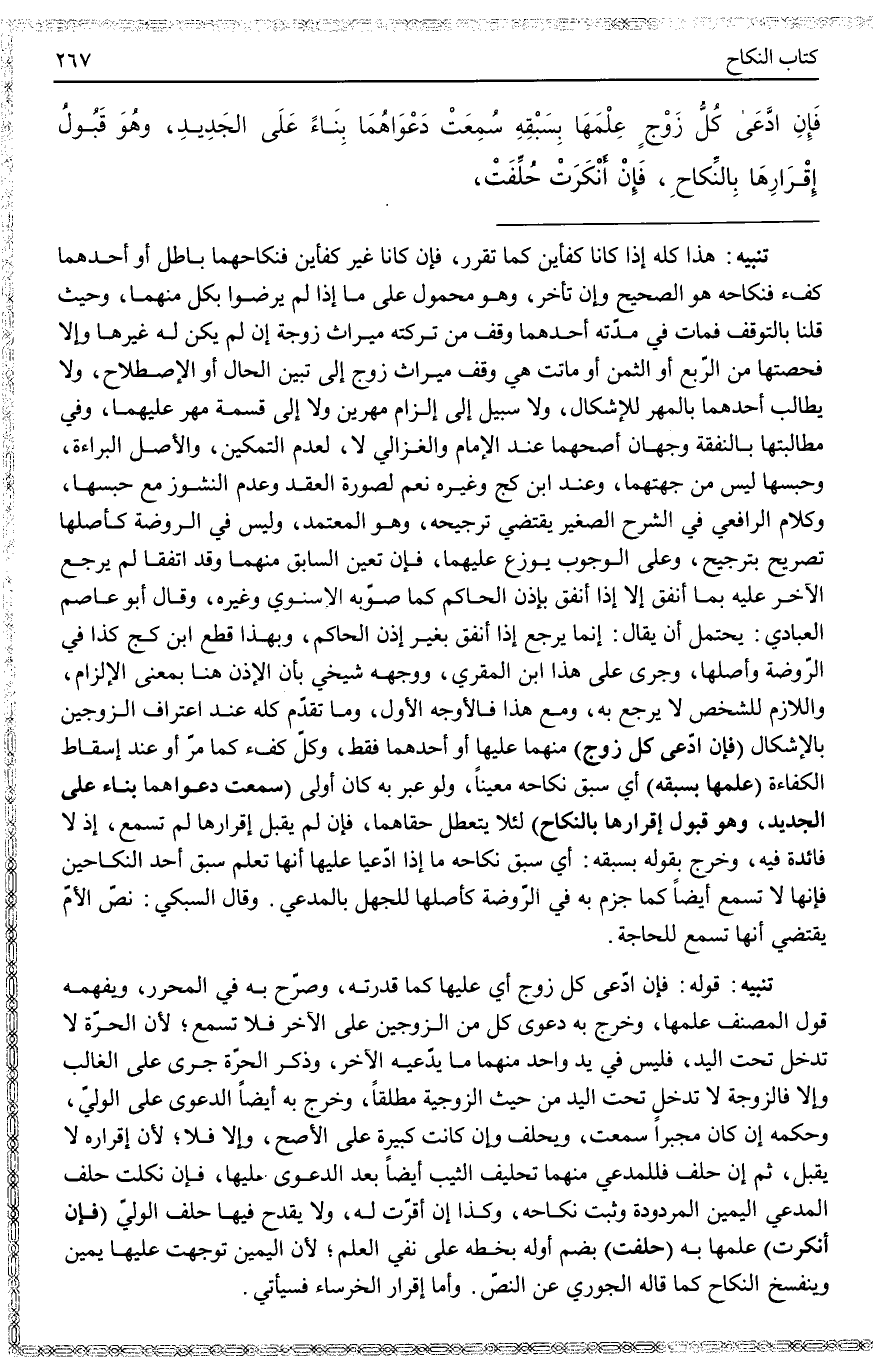 تَنْبِيهٌ: قَوْلُهُ: فَإِنْ ادَّعَى كُلُّ زَوْجٍ أَيْ عَلَيْهَا كَمَا قَدَّرْته، وَصَرَّحَ بِهِ فِي الْمُحَرَّرِ، وَيُفْهِمُهُ قَوْلُ الْمُصَنِّفُ عِلْمَهَا، وَخَرَجَ بِهِ دَعْوَى كُلٍّ مِنْ الزَّوْجَيْنِ عَلَى الْآخَرِ فَلَا تُسْمَعُ؛ لِأَنَّ الْحُرَّةَ لَا تَدْخُلُ تَحْتَ الْيَدِ، فَلَيْسَ فِي يَدِ وَاحِدٍ مِنْهُمَا مَا يَدَّعِيهِ الْآخَرُ، وَذِكْرُ الْحُرَّةِ جَرَى عَلَى الْغَالِبِ وَإِلَّا فَالزَّوْجَةُ لَا تَدْخُلُ تَحْتَ الْيَدِ مِنْ حَيْثُ الزَّوْجِيَّةُ مُطْلَقًا، وَخَرَجَ بِهِ أَيْضًا الدَّعْوَى عَلَى الْوَلِيِّ، وَحُكْمُهُ إنْ كَانَ مُجْبِرًا سُمِعَتْ، وَيَحْلِفُ وَإِنْ كَانَتْ كَبِيرَةً عَلَى الْأَصَحِّ، وَإِلَّا فَلَا؛ لِأَنَّ إقْرَارَهُ لَا يُقْبَلُ، ثُمَّ إنْ حَلَفَ فَلِلْمُدَّعِي مِنْهُمَا تَحْلِيفُ الثَّيِّبِ أَيْضًا بَعْدَ الدَّعْوَى عَلَيْهَا، فَإِنْ نَكَلَتْ حَلَفَ الْمُدَّعِي الْيَمِينَ الْمَرْدُودَةَ وَثَبَتَ نِكَاحُهُ، وَكَذَا إنْ أَقَرَّتْ لَهُ، وَلَا يَقْدَحُ فِيهَا حَلِفُ الْوَلِيِّ (فَإِنْ أَنْكَرَتْ) عِلْمَهَا بِهِ (حُلِّفَتْ) بِضَمِّ أَوَّلِهِ بِخَطِّهِ عَلَى نَفْيِ الْعِلْمِ؛ لِأَنَّ الْيَمِينَ تَوَجَّهَتْ عَلَيْهَا يَمِينٌ وَيَنْفَسِخُ النِّكَاحُ كَمَا قَالَهُ الْجُورِيُّ عَنْ النَّصِّ. وَأَمَّا إقْرَارُ الْخَرْسَاءِ فَسَيَأْتِي.