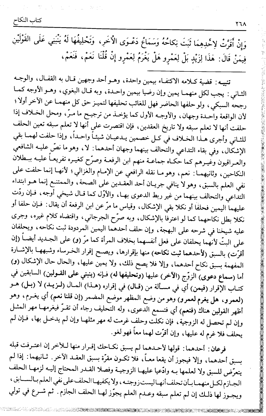 ـــــــــــــــــــــــــــــQتَنْبِيهٌ: قَضِيَّةُ كَلَامِهِ الِاكْتِفَاءِ بِيَمِينٍ وَاحِدَةٍ، وَهُوَ أَحَدُ وَجْهَيْنِ قَالَ بِهِ الْقَفَّالُ، وَالْوَجْهُ الثَّانِي: يَجِبُ لِكُلٍّ مِنْهُمَا يَمِينٌ وَإِنْ رَضِيَا بِيَمِينٍ وَاحِدَةٍ، وَبِهِ قَالَ الْبَغَوِيّ، وَهُوَ الْأَوْجَهُ كَمَا رَجَّحَهُ السُّبْكِيُّ، وَلَوْ حَلَّفَهَا الْحَاضِرُ فَهَلْ لِلْغَائِبِ تَحْلِيفُهَا لِتَمَيُّزِ حَقِّ كُلٍّ مِنْهُمَا عَنْ الْآخَرِ أَوْ لَا؛ لِأَنَّ الْوَاقِعَةَ وَاحِدَةٌ، وَجْهَانِ، وَالْأَوْجَهُ الْأَوَّلُ كَمَا يُؤْخَذُ مِنْ تَرْجِيحِ مَا مَرَّ، وَمَحَلُّ الْخِلَافِ إذَا حَلَفَتْ أَنَّهَا لَا تَعْلَمُ سَبْقَهُ وَلَا تَارِيخَ الْعَقْدَيْنِ، فَإِنْ اقْتَصَرَتْ عَلَى أَنَّهَا لَا تَعْلَمُ سَبْقَهُ تَعَيَّنَ الْحَلِفُ لِلثَّانِي وَأَجْرَى هَذَا الْخِلَافُ فِي كُلِّ خَصْمَيْنِ يَدَّعِيَانِ شَيْئًا وَاحِدًا، وَإِذَا حَلَفَتْ لَهُمَا بَقِيَ الْإِشْكَالُ، وَفِي بَقَاءِ التَّدَاعِي وَالتَّحَالُفِ بَيْنَهُمَا وَجْهَانِ. أَحَدُهُمَا: لَا، وَهُوَ مَا نَصَّ عَلَيْهِ الشَّافِعِيُّ وَالْعِرَاقِيُّونَ وَغَيْرُهُمْ كَمَا حَكَاهُ جَمَاعَةٌ مِنْهُمْ ابْنُ الرِّفْعَةِ وَصَرَّحَ كَغَيْرِهِ تَفْرِيعًا عَلَيْهِ بِبُطْلَانِ النِّكَاحَيْنِ، وَثَانِيهِمَا: نَعَمْ، وَهُوَ مَا نَقَلَهُ الرَّافِعِيُّ عَنْ الْإِمَامِ وَالْغَزَالِيِّ؛ لِأَنَّهَا إنَّمَا حَلَفَتْ عَلَى نَفْيِ الْعِلْمِ بِالسَّبْقِ، وَهُوَ لَا يُنَافِي جَرَيَانَ أَحَدِ الْعَقْدَيْنِ عَلَى الصِّحَّةِ، وَالْمُمْتَنِعُ إنَّمَا هُوَ ابْتِدَاءُ التَّدَاعِي وَالتَّحَالُفِ بَيْنَهُمَا مِنْ غَيْرِ رَبْطِ الدَّعْوَى بِهَا، وَالْأَوَّلُ كَمَا قَالَ شَيْخِي أَوْجَهُ، فَإِنْ رَدَّتْ عَلَيْهِمَا الْيَمِينَ فَحَلَفَا أَوْ نَكَلَا بَقِيَ الْإِشْكَالُ، وَقِيَاسُ مَا مَرَّ عَنْ ابْنِ الرِّفْعَةِ أَنْ يُقَالَ: فَإِنْ حَلَفَا أَوْ نَكَلَا بَطَلَ نِكَاحُهُمَا كَمَا لَوْ اعْتَرَفَا بِالْإِشْكَالِ، وَبِهِ صَرَّحَ الْجُرْجَانِيِّ، وَاقْتَضَاهُ كَلَامُ غَيْرِهِ، وَجَرَى عَلَيْهِ شَيْخُنَا فِي شَرْحِهِ عَلَى الْبَهْجَةِ.
