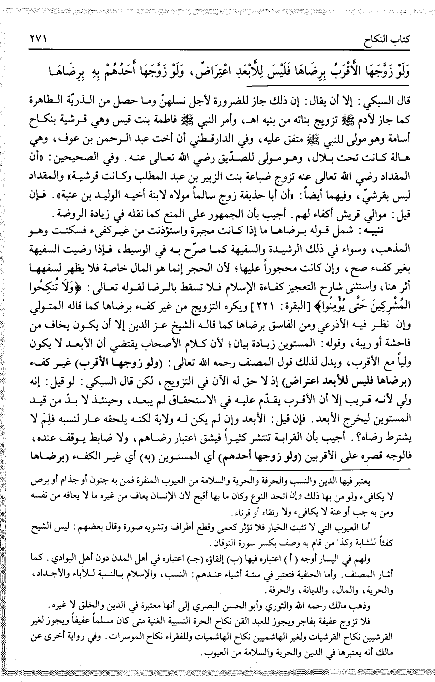 «وَأَمَرَ النَّبِيُّ - صَلَّى اللَّهُ عَلَيْهِ وَسَلَّمَ - فَاطِمَةَ بِنْتَ قَيْسٍ وَهِيَ قُرَشِيَّةٌ بِنِكَاحِ أُسَامَةَ وَهُوَ مَوْلًى لِلنَّبِيِّ - صَلَّى اللَّهُ عَلَيْهِ وَسَلَّمَ -» مُتَّفَقٌ عَلَيْهِ، وَفِي الدَّارَقُطْنِيّ أَنَّ أُخْتَ عَبْدِ الرَّحْمَنِ بْنِ عَوْفٍ وَهِيَ هَالَةُ كَانَتْ تَحْتَ بِلَالٍ، وَهُوَ مَوْلًى لِلصِّدِّيقِ - رَضِيَ اللَّهُ تَعَالَى عَنْهُ -. وَفِي الصَّحِيحَيْنِ: " أَنَّ الْمِقْدَادَ - رَضِيَ اللَّهُ تَعَالَى عَنْهُ - تَزَوَّجَ ضُبَاعَةَ بِنْتَ الزُّبَيْرِ بْنِ عَبْدِ الْمُطَّلِبِ وَكَانَتْ قُرَشِيَّةً " وَالْمِقْدَادُ لَيْسَ بِقُرَشِيٍّ، وَفِيهِمَا أَيْضًا: " أَنَّ أَبَا حُذَيْفَةَ زَوَّجَ سَالِمًا مَوْلَاهُ لِابْنَةِ أَخِيهِ الْوَلِيدِ بْنِ عُتْبَةَ ".