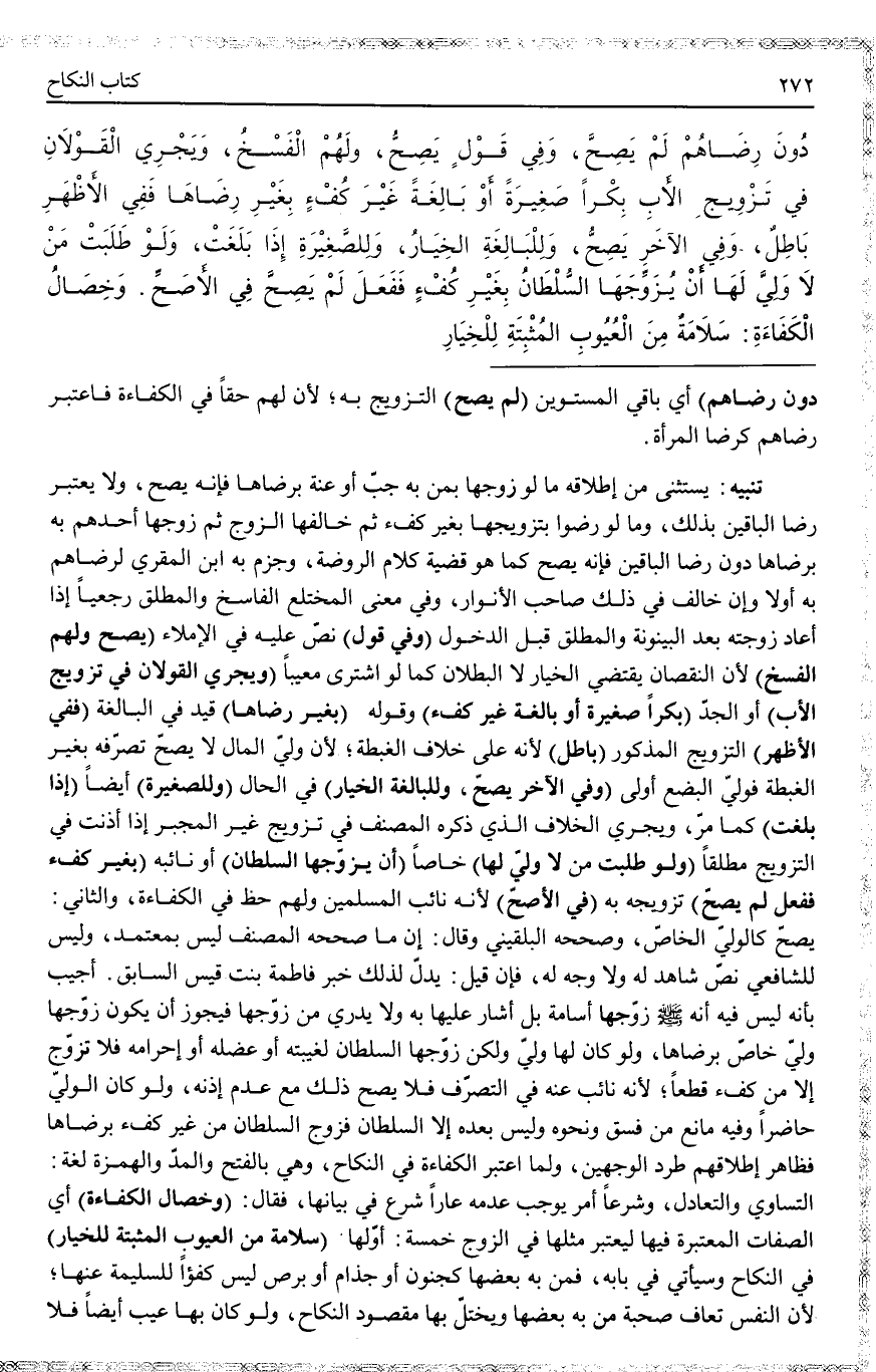 ـــــــــــــــــــــــــــــQدُونَ رِضَاهُمْ) أَيْ بَاقِي الْمُسْتَوِينَ (لَمْ يَصِحَّ) التَّزْوِيجُ بِهِ؛ لِأَنَّ لَهُمْ حَقًّا فِي الْكَفَاءَةِ فَاعْتُبِرَ رِضَاهُمْ كَرِضَا الْمَرْأَةِ.