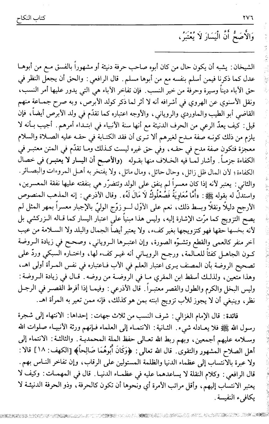 ـــــــــــــــــــــــــــــQالشَّيْخَانِ: يُشْبِهُ أَنْ يَكُونَ حَالُ مَنْ كَانَ أَبُوهُ صَاحِبَ حِرْفَةٍ دَنِيئَةٍ أَوْ مَشْهُورًا بِالْفِسْقِ مَعَ مَنْ أَبُوهَا عَدْلٌ كَمَا ذَكَرْنَا فِيمَنْ أَسْلَمَ بِنَفْسِهِ مَعَ مَنْ أَبُوهَا مُسْلِمٌ. قَالَ الرَّافِعِيُّ: وَالْحَقُّ أَنْ يُجْعَلَ النَّظَرُ فِي حَقِّ الْآبَاءِ دِينًا وَسِيرَةً وَحِرْفَةً مِنْ خَيْرِ النَّسَبِ.