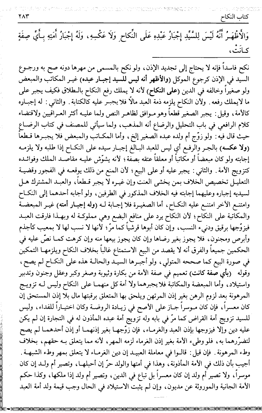 وَالْأَظْهَرُ أَنَّهُ لَيْسَ لِلسَّيِّدِ إجْبَارُ عَبْدِهِ عَلَى النِّكَاحِ وَلَا عَكْسُهُ، وَلَهُ إجْبَارُ أَمَتِهِ بِأَيِّ صِفَةٍ كَانَتْ،