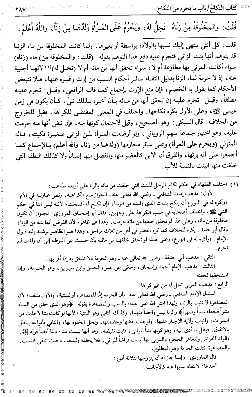 قُلْت: وَالْمَخْلُوقَةُ مِنْ زِنَاهُ تَحِلُّ لَهُ، وَيَحْرُمُ عَلَى الْمَرْأَةِ وَلَدُهَا مِنْ زِنًا، وَاَللَّهُ أَعْلَمُ،