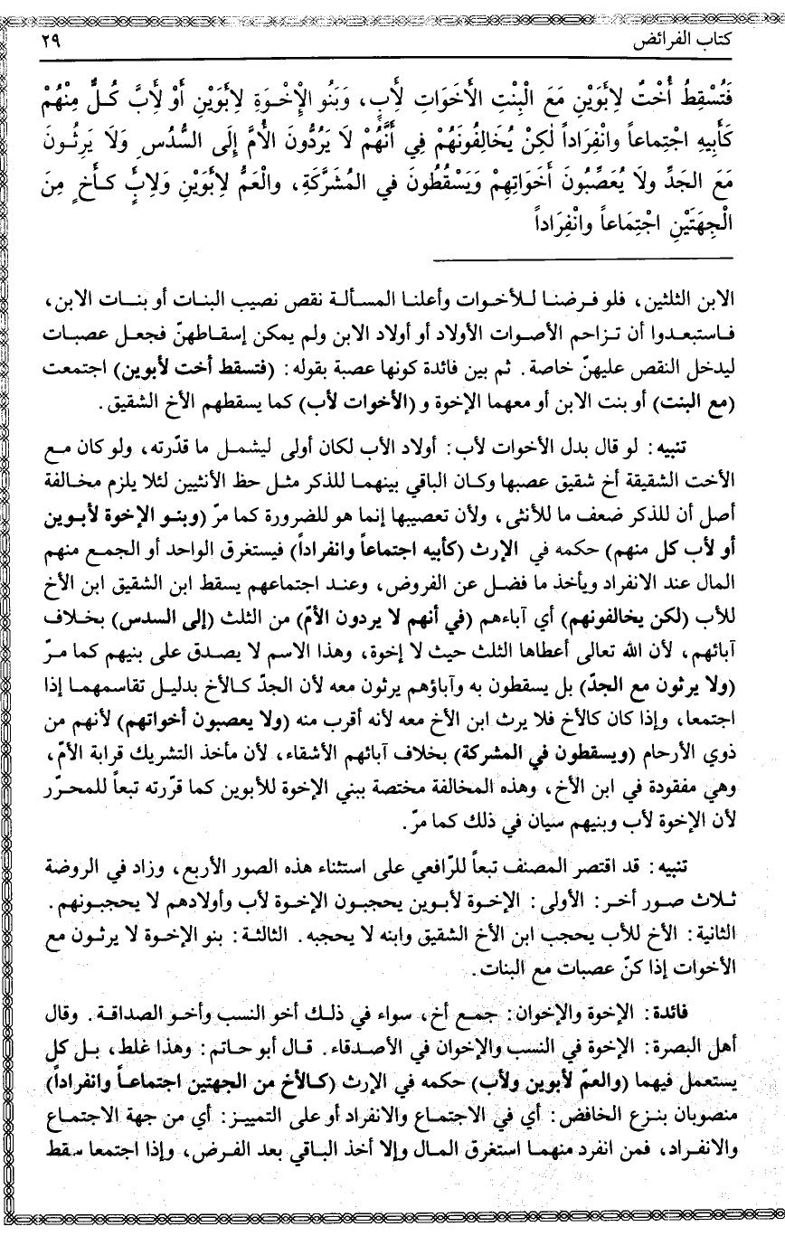 تَنْبِيهٌ: قَدْ اقْتَصَرَ الْمُصَنِّفُ تَبَعًا لِلرَّافِعِيِّ عَلَى اسْتِثْنَاءِ هَذِهِ الصُّوَرِ الْأَرْبَعِ، وَزَادَ فِي الرَّوْضَةِ ثَلَاثَ صُوَرٍ أُخَرَ: الْأُولَى: الْإِخْوَةُ لِأَبَوَيْنِ يَحْجُبُونَ الْإِخْوَةَ لِأَبٍ وَأَوْلَادُهُمْ لَا يَحْجُبُونَهُمْ الثَّانِيَةُ: الْأَخُ لِلْأَبِ يَحْجُبُ ابْنَ الْأَخِ الشَّقِيقِ وَابْنُهُ لَا يَحْجُبُهُ. الثَّالِثَةُ: بَنُو الْإِخْوَةِ لَا يَرِثُونَ مَعَ الْأَخَوَاتِ إذَا كُنَّ عَصَبَاتٍ مَعَ الْبَنَاتِ. فَائِدَةٌ: الْإِخْوَةُ وَالْإِخْوَانُ: جَمْعُ أَخٍ، سَوَاءٌ فِي ذَلِكَ أَخُو النَّسَبِ، وَأَخُو الصَّدَاقَةِ.