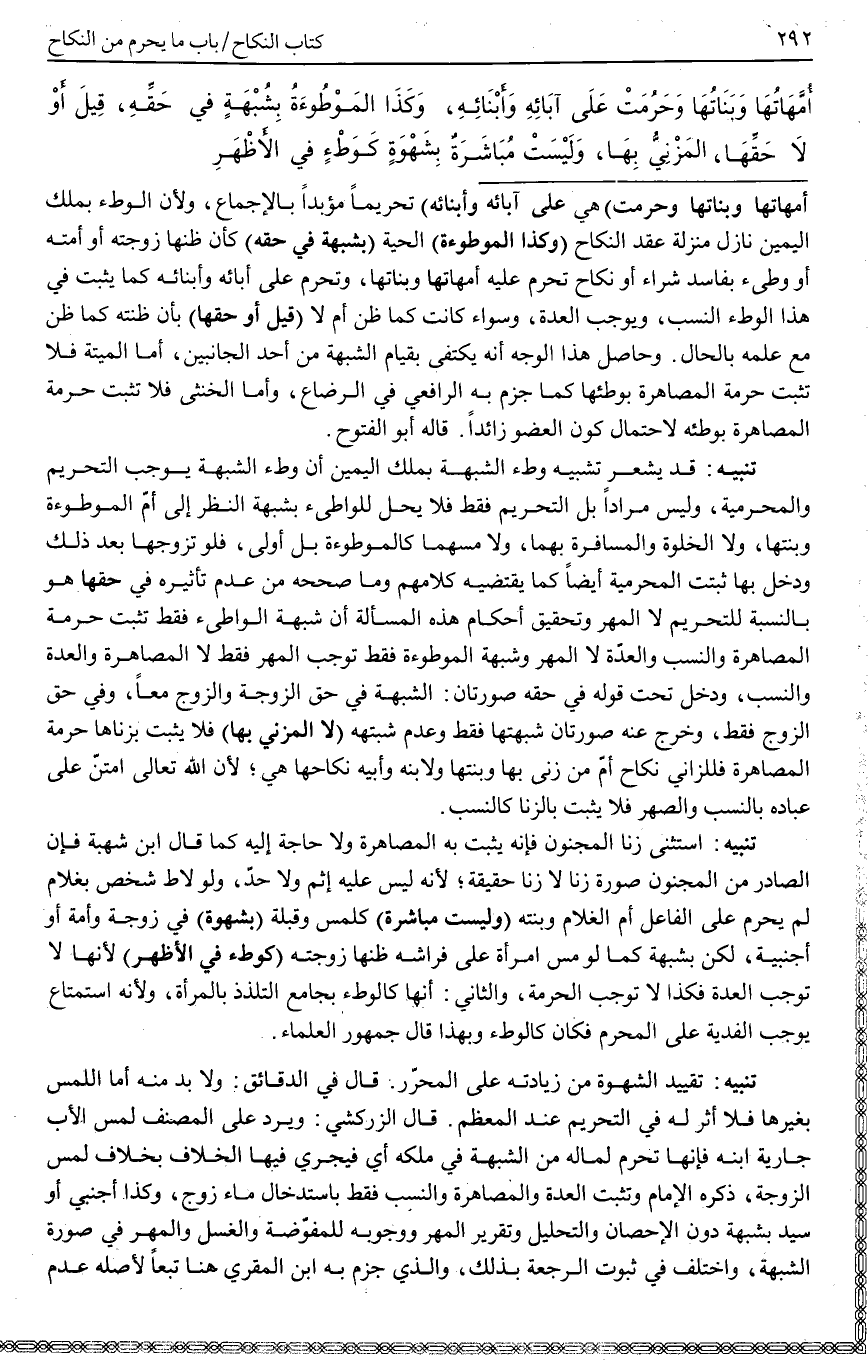 تَنْبِيهٌ: قَدْ يُشْعِرُ تَشْبِيهُ وَطْءِ الشُّبْهَةِ بِمِلْكِ الْيَمِينِ أَنَّ وَطْءَ الشُّبْهَةِ يُوجِبُ التَّحْرِيمَ وَالْمَحْرَمِيَّةَ، وَلَيْسَ مُرَادًا بَلْ التَّحْرِيمُ فَقَطْ فَلَا يَحِلُّ لِلْوَاطِئِ بِشُبْهَةٍ النَّظَرُ إلَى أُمِّ الْمَوْطُوءَةِ وَبِنْتِهَا، وَلَا الْخَلْوَةُ وَالْمُسَافَرَةُ بِهِمَا، وَلَا مَسُّهُمَا كَالْمَوْطُوءَةِ بَلْ أَوْلَى، فَلَوْ تَزَوَّجَهَا بَعْدَ ذَلِكَ وَدَخَلَ بِهَا ثَبَتَتْ الْمَحْرَمِيَّةُ أَيْضًا كَمَا يَقْتَضِيهِ كَلَامُهُمْ وَمَا صَحَّحَهُ مِنْ عَدَمِ تَأْثِيرِهِ فِي حَقِّهَا هُوَ بِالنِّسْبَةِ لِلتَّحْرِيمِ لَا الْمَهْرِ وَتَحْقِيقُ أَحْكَامِ هَذِهِ الْمَسْأَلَةِ أَنَّ شُبْهَةَ الْوَاطِئِ فَقَطْ تُثْبِتُ حُرْمَةَ الْمُصَاهَرَةِ وَالنَّسَبِ وَالْعِدَّةِ لَا الْمَهْرَ وَشُبْهَةُ الْمَوْطُوءَةِ فَقَطْ تُوجِبُ الْمَهْرَ فَقَطْ لَا الْمُصَاهَرَةَ وَالْعِدَّةَ وَالنَّسَبَ، وَدَخَلَ تَحْتَ قَوْلِهِ فِي حَقِّهِ صُورَتَانِ: الشُّبْهَةُ فِي حَقِّ الزَّوْجَةِ وَالزَّوْجِ مَعًا، وَفِي حَقِّ الزَّوْجِ فَقَطْ، وَخَرَجَ عَنْهُ صُورَتَانِ شُبْهَتُهَا فَقَطْ وَعَدَمُ شُبْهَتِهِ (لَا الْمَزْنِيُّ بِهَا) فَلَا يَثْبُتُ بِزِنَاهَا حُرْمَةُ الْمُصَاهَرَةِ فَلِلزَّانِي نِكَاحُ أُمِّ مَنْ زَنَى بِهَا وَبِنْتِهَا وَلِابْنِهِ وَأَبِيهِ نِكَاحُهَا هِيَ؛ لِأَنَّ اللَّهَ تَعَالَى امْتَنَّ عَلَى عِبَادِهِ بِالنَّسَبِ وَالصِّهْرِ فَلَا يَثْبُتُ بِالزِّنَا كَالنَّسَبِ.