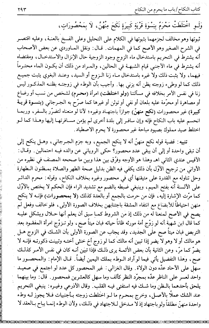 وَهَذَا هُوَ الْأَوْجَهُ وَفَرَّقَ بَيْنَ هَذَا وَبَيْنَ مَا صَحَّحَهُ الْمُصَنِّفُ فِي نَظِيرِهِ مِنْ الْأَوَانِي مِنْ تَرْجِيحِ الْأَوَّلِ بِأَنَّ ذَلِكَ يَكْفِي فِيهِ الظَّنُّ بِدَلِيلِ صِحَّةِ الطُّهْرِ وَالصَّلَاةِ بِمَظْنُونِ الطَّهَارَةِ وَحِلِّ تَنَاوُلِهِ مَعَ الْقُدْرَةِ عَلَى مُتَيَقِّنِهَا أَيْ فِي مَحْصُورٍ وَغَيْرِهِ بِخِلَافِ النِّكَاحِ، وَقَوْلُهُ: مَحْرَمُ الدَّائِرِ عَلَى الْأَلْسِنَةِ أَنَّهُ بِفَتْحِ الْمِيمِ، وَيَنْبَغِي ضَبْطُهُ بِالضَّمِّ مَعَ تَشْدِيدِ الرَّاءِ فَإِنَّ الْحُكْمَ لَا يَخْتَصُّ بِالْأَوَّلِ كَمَا مَرَّتْ الْإِشَارَةُ إلَيْهِ، فَإِنْ مَنْ حَرُمَتْ بِالْجَمْعِ أَوْ بِالْعِدَّةِ كَذَلِكَ (لَا بِمَحْصُورَاتٍ) فَإِنَّهُ لَا يَنْكِحُ مِنْهُنَّ احْتِيَاطًا لِلْأَبْضَاعِ مَعَ انْتِفَاءِ الْمَشَقَّةِ بِاجْتِنَابِهِنَّ بِخِلَافِ الصُّورَةِ الْأُولَى، فَلَوْ خَالَفَ وَفَعَلَ لَمْ يَصِحَّ فِي الْأَصَحِّ لِمَنْعِنَا لَهُ مِنْ ذَلِكَ؛ إذْ مِنْ الشُّرُوطِ كَمَا سَبَقَ أَنْ يَعْلَمَ أَنَّهَا حَلَالٌ وَيَشْكُلُ عَلَيْهِ كَمَا قَالَ ابْنُ شُهْبَةَ أَنَّهُ لَوْ زَوَّجَ أَمَةَ مُوَرِّثِهِ ظَانًّا حَيَاتَهُ فَبَانَ مَيِّتًا صَحَّ، وَلَوْ تَزَوَّجَ امْرَأَةَ الْمَفْقُودِ بَعْدَ التَّرَبُّصِ فَبَانَ مَيِّتًا صَحَّ عَلَى الْجَدِيدِ، وَقَدْ يُجَابُ عَنْ الصُّورَةِ الْأُولَى بِأَنَّ الشَّكَّ فِي الزَّوْجِ هَلْ هُوَ مَالِكٌ أَوْ لَا وَهُوَ لَا يَضُرُّ إذَا تَبَيَّنَ أَنَّهُ مَالِكٌ كَمَا لَوْ زَوَّجَ أَخٌ خُنْثَى أُخْتَهُ وَتَبَيَّنَتْ ذُكُورَتُهُ فَإِنَّهُ لَا يَضُرُّ كَمَا مَرَّ، وَعَنْ الثَّانِيَةِ بِأَنَّ بَعْضَ الْأَئِمَّةِ يَرَى ذَلِكَ فَإِذَا تَبَيَّنَ أَنَّهُ كَانَ فِي نَفْسِ الْأَمْرِ كَذَلِكَ صَحَّ، وَهَذَا التَّفْصِيلُ يَأْتِي فِيمَا لَوْ أَرَادَ الْوَطْءَ بِمِلْكِ الْيَمِينِ أَيْضًا، قَالَ الْإِمَامُ: وَالْمَحْصُورُ مَا سَهُلَ عَلَى الْآحَادِ عَدُّهُ دُونَ الْوُلَاةِ. وَقَالَ الْغَزَالِيُّ: غَيْرُ الْمَحْصُورِ كُلُّ عَدَدٍ لَوْ اجْتَمَعَ فِي صَعِيدٍ وَاحِدٍ لَعَسُرَ عَلَى النَّاظِرِ عَدُّهُ بِمُجَرَّدِ النَّظَرِ كَأَلْفٍ وَمَا سَهُلَ كَالْعِشْرِينَ فَمَحْصُورٌ. قَالَ: وَمَا بَيْنَهُمَا يَلْحَقُ بِأَحَدِهِمَا بِالظَّنِّ وَمَا شَكَّ فِيهِ اسْتَفْتَى فِيهِ الْقَلْبَ. وَقَالَ الْأَذْرَعِيُّ وَغَيْرُهُ: يَنْبَغِي التَّحْرِيمُ عِنْدَ الشَّكِّ عَمَلًا بِالْأَصْلِ، وَخَرَجَ بِمَحْرَمٍ مَا لَوْ اخْتَلَطَتْ زَوْجَتُهُ بِأَجْنَبِيَّاتٍ. فَلَا يَجُوزُ لَهُ وَطْءُ وَاحِدَةٍ مِنْهُنَّ مُطْلَقًا وَلَوْ بِاجْتِهَادٍ؛ إذْ لَا مَدْخَلَ لِلِاجْتِهَادِ فِي ذَلِكَ، وَلِأَنَّ الْوَطْءَ إنَّمَا يُبَاحُ بِالْعَقْدِ لَا