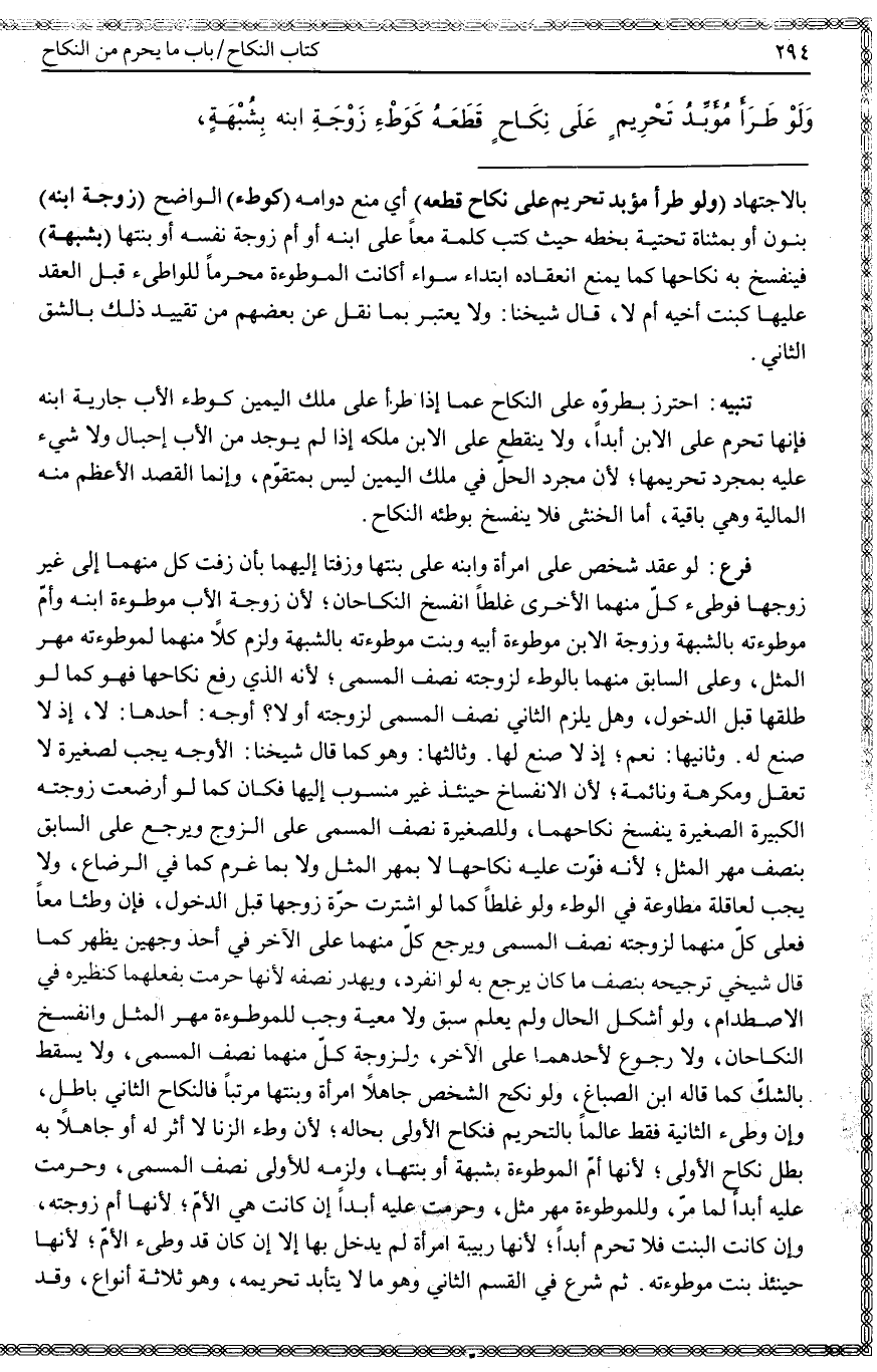 ـــــــــــــــــــــــــــــQبِالِاجْتِهَادِ (وَلَوْ طَرَأَ مُؤَبِّدُ تَحْرِيمٍ عَلَى نِكَاحٍ قَطَعَهُ) أَيْ مَنَعَ دَوَامَهُ (كَوَطْءِ) الْوَاضِحِ (زَوْجَةِ ابْنِهِ) بِنُونٍ أَوْ بِمُثَنَّاةٍ تَحْتِيَّةٍ بِخَطِّهِ حَيْثُ كَتَبَ كَلِمَةَ مَعًا عَلَى ابْنِهِ أَوْ أُمِّ زَوْجَةِ نَفْسِهِ أَوْ بِنْتِهَا (بِشُبْهَةٍ) فَيَنْفَسِخُ بِهِ نِكَاحُهَا، كَمَا يُمْنَعُ انْعِقَادَهُ ابْتِدَاءً سَوَاءٌ أَكَانَتْ الْمَوْطُوءَةُ مَحْرَمًا لِلْوَاطِئِ قَبْلَ الْعَقْدِ عَلَيْهَا كَبِنْتِ أَخِيهِ أَمْ لَا، قَالَ شَيْخُنَا: وَلَا يُعْتَبَرُ بِمَا نُقِلَ عَنْ بَعْضِهِمْ مِنْ تَقْيِيدِ ذَلِكَ بِالشِّقِّ الثَّانِي.