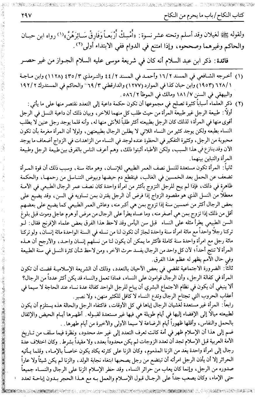 ـــــــــــــــــــــــــــــQ «وَلِقَوْلِهِ - صَلَّى اللَّهُ عَلَيْهِ وَسَلَّمَ - لِغَيْلَانَ وَقَدْ أَسْلَمَ وَتَحْتَهُ عَشْرُ نُسْوَةٍ: أَمْسِكْ أَرْبَعًا وَفَارِقْ سَائِرَهُنَّ» رَوَاهُ ابْنُ حِبَّانَ وَالْحَاكِمُ وَغَيْرُهُمَا وَصَحَّحُوهُ، وَإِذَا امْتَنَعَ فِي الدَّوَامِ فَفِي الِابْتِدَاءِ أَوْلَى. فَائِدَةٌ: ذَكَرَ ابْنُ عَبْدِ السَّلَامِ أَنَّهُ كَانَ فِي شَرِيعَةِ مُوسَى - عَلَيْهِ السَّلَامُ - الْجَوَازُ مِنْ غَيْرِ حَصْرٍ