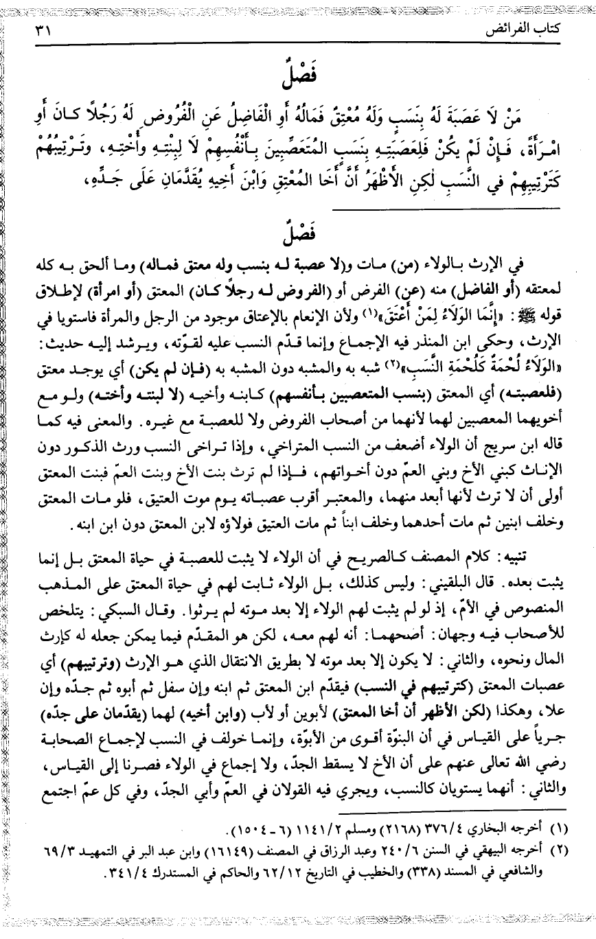 فَصْلٌ مَنْ لَا عَصَبَةَ لَهُ بِنَسَبٍ وَلَهُ مُعْتِقٌ فَمَالُهُ أَوْ الْفَاضِلُ عَنْ الْفُرُوضِ لَهُ رَجُلًا كَانَ أَوْ امْرَأَةً، فَإِنْ لَمْ يَكُنْ فَلِعَصَبَتِهِ بِنَسَبٍ الْمُتَعَصِّبِينَ بِأَنْفُسِهِمْ لَا لِبِنْتِهِ وَأُخْتِهِ، وَتَرْتِيبُهُمْ كَتَرْتِيبِهِمْ فِي النَّسَبِ لَكِنْ الْأَظْهَرُ أَنَّ أَخَا الْمُعْتِقِ وَابْنَ أَخِيهِ يُقَدَّمَانِ عَلَى جَدِّهِ،