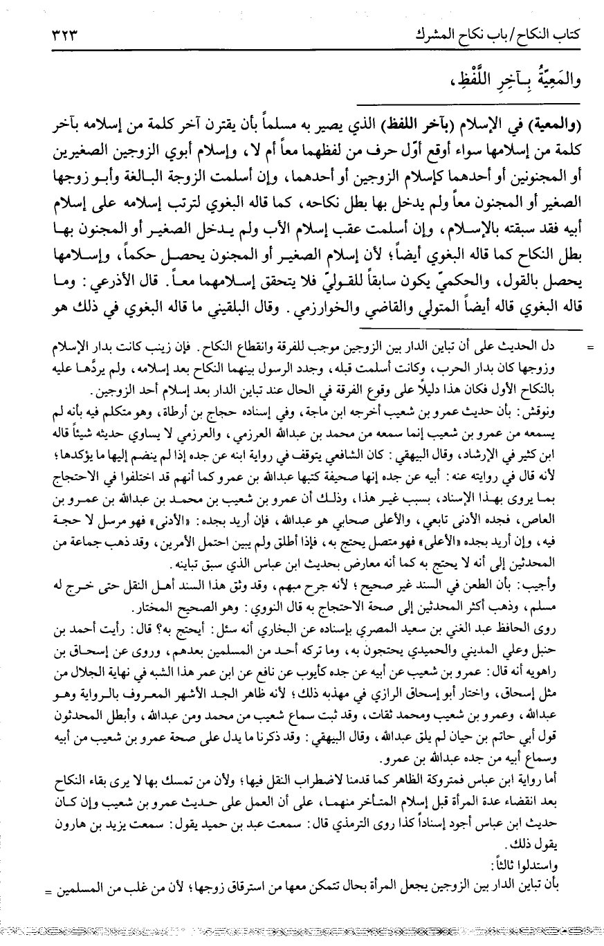 ـــــــــــــــــــــــــــــQ (وَالْمَعِيَّةُ) فِي الْإِسْلَامِ (بِآخِرِ اللَّفْظِ) الَّذِي يَصِيرُ بِهِ مُسْلِمًا بِأَنْ يَقْتَرِنَ آخِرُ كَلِمَةٍ مِنْ إسْلَامِهِ بِآخِرِ كَلِمَةٍ مِنْ إسْلَامِهَا سَوَاءٌ أَوْقَعَ أَوَّلَ حَرْفٍ مِنْ لَفْظِهِمَا مَعًا أَمْ لَا، وَإِسْلَامُ أَبَوَيْ الزَّوْجَيْنِ الصَّغِيرَيْنِ أَوْ الْمَجْنُونَيْنِ أَوْ أَحَدِهِمَا كَإِسْلَامِ الزَّوْجَيْنِ أَوْ أَحَدِهِمَا، وَإِنْ أَسْلَمَتْ الزَّوْجَةُ الْبَالِغَةُ وَأَبُو زَوْجِهَا الصَّغِيرِ أَوْ الْمَجْنُونِ مَعًا وَلَمْ يَدْخُلْ بِهَا بَطَلَ نِكَاحُهُ، كَمَا قَالَ الْبَغَوِيّ لِتَرَتُّبِ إسْلَامِهِ عَلَى إسْلَامِ أَبِيهِ فَقَدْ سَبَقَتْهُ بِالْإِسْلَامِ، وَإِنْ أَسْلَمَتْ عَقِبَ إسْلَامِ الْأَبِ وَلَمْ يَدْخُلْ الصَّغِيرُ أَوْ الْمَجْنُونُ بِهَا بَطَلَ النِّكَاحُ كَمَا قَالَهُ الْبَغَوِيّ أَيْضًا؛ لِأَنَّ إسْلَامَ الصَّغِيرِ أَوْ الْمَجْنُونِ يَحْصُلُ حُكْمًا، وَإِسْلَامَهَا يَحْصُلُ بِالْقَوْلِ، وَالْحُكْمِيُّ يَكُونُ سَابِقًا لِلْقَوْلِيِّ فَلَا يَتَحَقَّقُ إسْلَامُهُمَا مَعًا. قَالَ الْأَذْرَعِيُّ: وَمَا قَالَهُ الْبَغَوِيّ قَالَهُ أَيْضًا الْمُتَوَلِّي وَالْقَاضِي وَالْخُوَارِزْمِيّ. وَقَالَ الْبُلْقِينِيُّ مَا قَالَهُ الْبَغَوِيّ فِي ذَلِكَ هُوَ