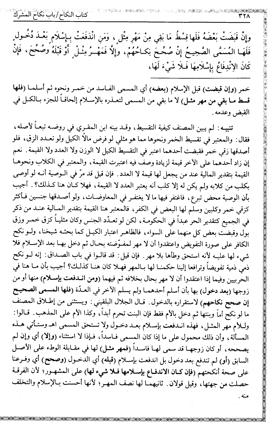 ـــــــــــــــــــــــــــــQخَمْرٍ (وَإِنْ قَبَضَتْ) قَبْلَ الْإِسْلَامِ (بَعْضَهُ) أَيْ الْمُسَمَّى الْفَاسِدَ مِنْ خَمْرٍ وَنَحْوِهِ ثُمَّ أَسْلَمَا (فَلَهَا قِسْطُ مَا بَقِيَ مِنْ مَهْرِ مِثْلٍ) لَا مَا بَقِيَ مِنْ الْمُسَمَّى لِتَعَذُّرِهِ بِالْإِسْلَامِ إلْحَاقًا لِلْجُزْءِ بِالْكُلِّ فِي الْقَبْضِ وَعَدَمِهِ.