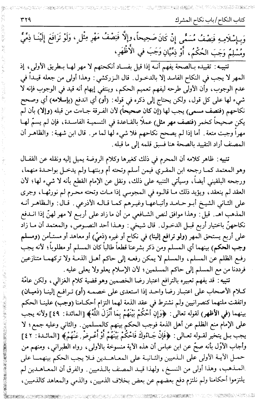 ـــــــــــــــــــــــــــــQتَنْبِيهٌ: تَقْيِيدُهُ بِالصِّحَّةِ يُفْهِمُ أَنَّهُ إذَا قِيلَ بِفَسَادِ أَنْكِحَتِهِمْ لَا مَهْرَ لَهَا بِطَرِيقِ الْأَوْلَى، إذْ الْمَهْرُ لَا يَجِبُ فِي النِّكَاحِ الْفَاسِدِ إلَّا بِالدُّخُولِ. قَالَ الزَّرْكَشِيُّ: وَهَذَا أَوْلَى مِنْ جَعْلِهِ قَيْدًا فِي عَدَمِ الْوُجُوبِ، وَأَنَّ الْأَوْلَى طَرْحُهُ لِيُفْهَمَ تَعْمِيمُ الْحُكْمِ، وَيَنْتَفِيَ إيهَامُ أَنَّهُ قَيْدٌ فِي الْوُجُوبِ فَإِنَّهُ لَا شَيْءَ لَهَا عَلَى كُلِّ قَوْلٍ، وَلَكِنْ يُحْتَاجُ إلَى ذِكْرِهِ فِي قَوْلِهِ: (أَوْ) أَيْ انْدَفَعَ (بِإِسْلَامِهِ) أَيْ وَصُحِّحَ نِكَاحُهُمْ (فَنِصْفُ مُسَمًّى) يَجِبُ لَهَا (إنْ كَانَ صَحِيحًا) لِأَنَّ الْفُرْقَةَ جَاءَتْ مِنْ قِبَلِهِ (وَإِلَّا) بِأَنْ لَمْ يَكُنْ صَحِيحًا كَخَمْرٍ (فَنِصْفُ مَهْرِ مِثْلٍ) عَمَلًا بِالْقَاعِدَةِ فِي التَّسْمِيَةِ الْفَاسِدَةِ، فَإِنْ لَمْ يُسَمِّ لَهَا مَهْرًا وَجَبَتْ مُتْعَةٌ. أَمَّا إذَا لَمْ يُصَحَّحْ نِكَاحُهُمْ فَلَا شَيْءَ لَهَا لِمَا مَرَّ. قَالَ ابْنُ شُهْبَةَ: وَالظَّاهِرُ أَنَّ الْمُصَنِّفَ أَرَادَ التَّقْيِيدَ بِالصِّحَّةِ هُنَا فَسَبَقَ قَلَمُهُ إلَى مَا فِي قَلْبِهِ.