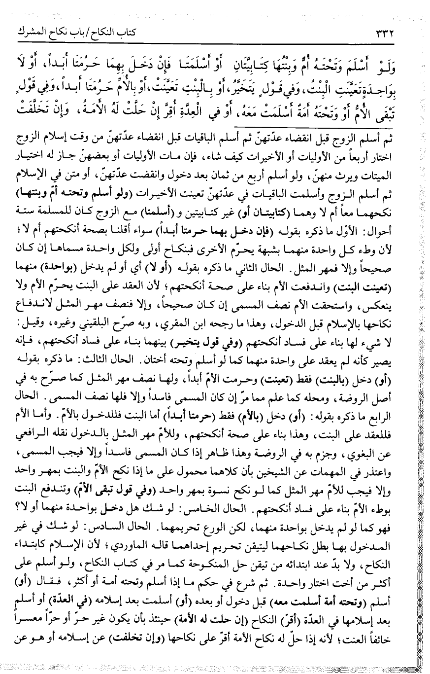 (وَلَوْ أَسْلَمَ وَتَحْتَهُ أُمٌّ وَبِنْتُهَا) نَكَحَهُمَا مَعًا أَمْ لَا وَهُمَا (كِتَابِيَّتَانِ أَوْ) غَيْرُ كِتَابِيَّتَيْنِ وَ (أَسْلَمَتَا) مَعَ الزَّوْجِ كَانَ لِلْمُسْلِمَةِ سِتَّةُ أَحْوَالٍ: الْأَوَّلُ مَا ذَكَرَهُ بِقَوْلِهِ (فَإِنْ دَخَلَ بِهَا حَرُمَتَا أَبَدًا) سَوَاءٌ أَقُلْنَا بِصِحَّةِ أَنْكِحَتِهِمْ أَمْ لَا؛ لِأَنَّ وَطْءَ كُلِّ وَاحِدَةٍ مِنْهُمَا بِشُبْهَةٍ يُحَرِّمُ الْأُخْرَى فَبِنِكَاحٍ أَوْلَى وَلِكُلِّ وَاحِدَةٍ مُسَمَّاهَا إنْ كَانَ صَحِيحًا وَإِلَّا فَمَهْرُ الْمِثْلِ.