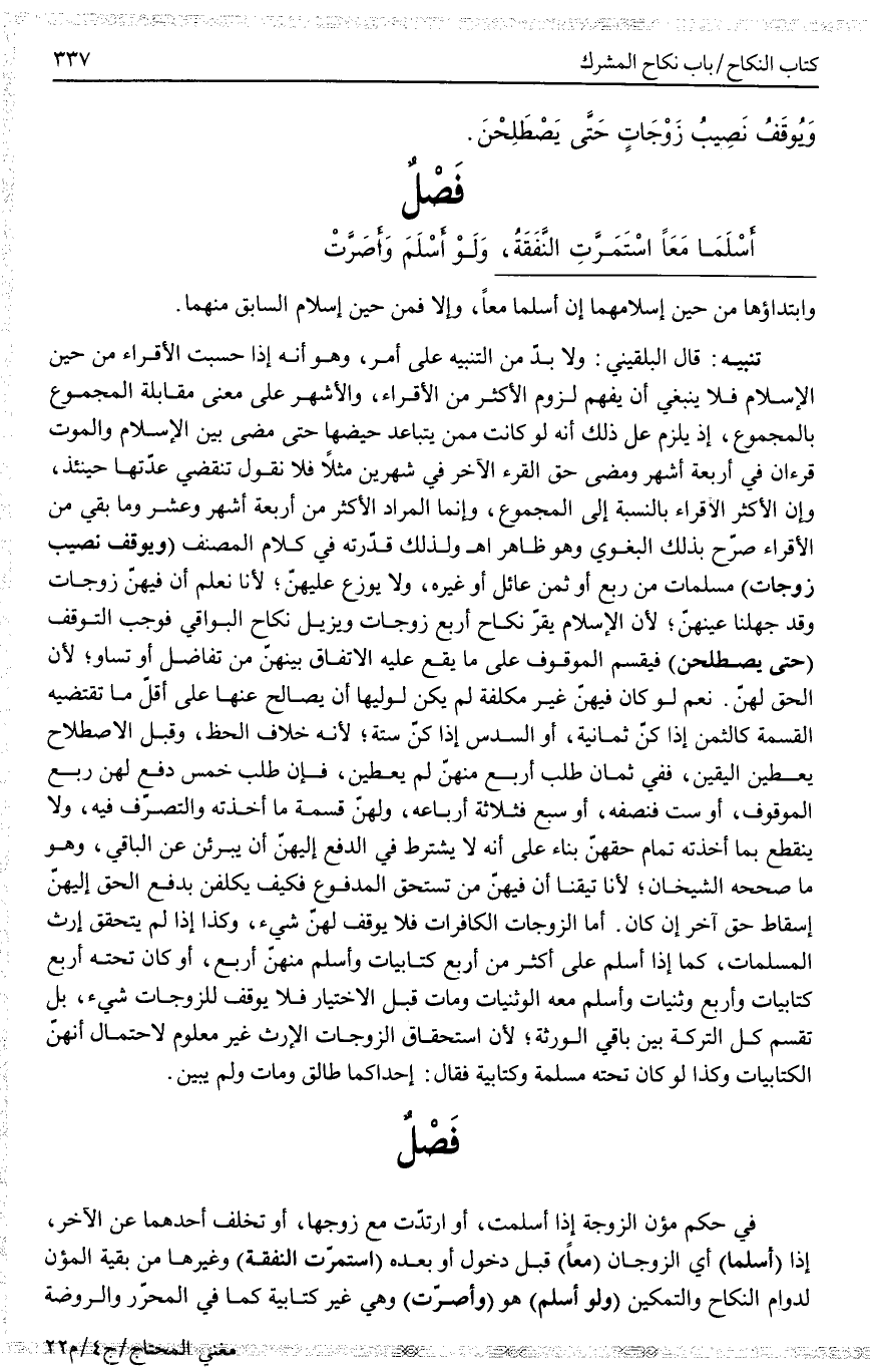 فَصْلٌ فِي حُكْمِ مُؤَنِ الزَّوْجَةِ إذَا أَسْلَمَتْ، أَوْ ارْتَدَّتْ مَعَ زَوْجِهَا، أَوْ تَخَلَّفَ أَحَدُهُمَا عَنْ الْآخَرِ، إذَا (أَسْلَمَا) أَيْ الزَّوْجَانِ (مَعًا) قَبْلَ دُخُولٍ أَوْ بَعْدَهُ (اسْتَمَرَّتْ النَّفَقَةُ) وَغَيْرُهَا مِنْ بَقِيَّةِ الْمُؤَنِ لِدَوَامِ النِّكَاحِ وَالتَّمْكِينِ (وَلَوْ أَسْلَمَ) هُوَ (وَأَصَرَّتْ) وَهِيَ غَيْرُ كِتَابِيَّةٍ كَمَا فِي الْمُحَرَّرِ وَالرَّوْضَةِ