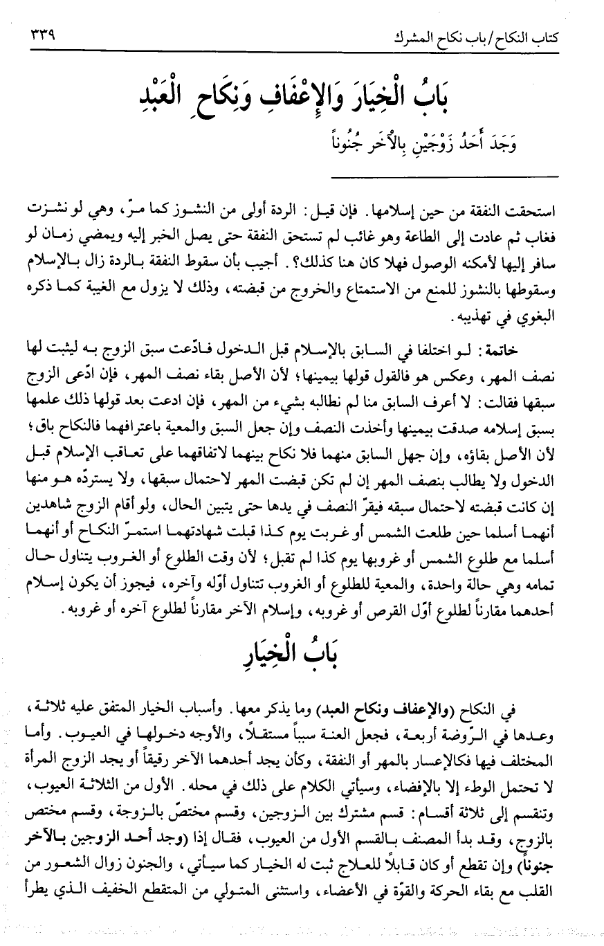 بَابُ الْخِيَارِ وَالْإِعْفَافِ وَنِكَاحِ الْعَبْدِ وَجَدَ أَحَدُ الزَّوْجَيْنِ بِالْآخَرِ جُنُونًا