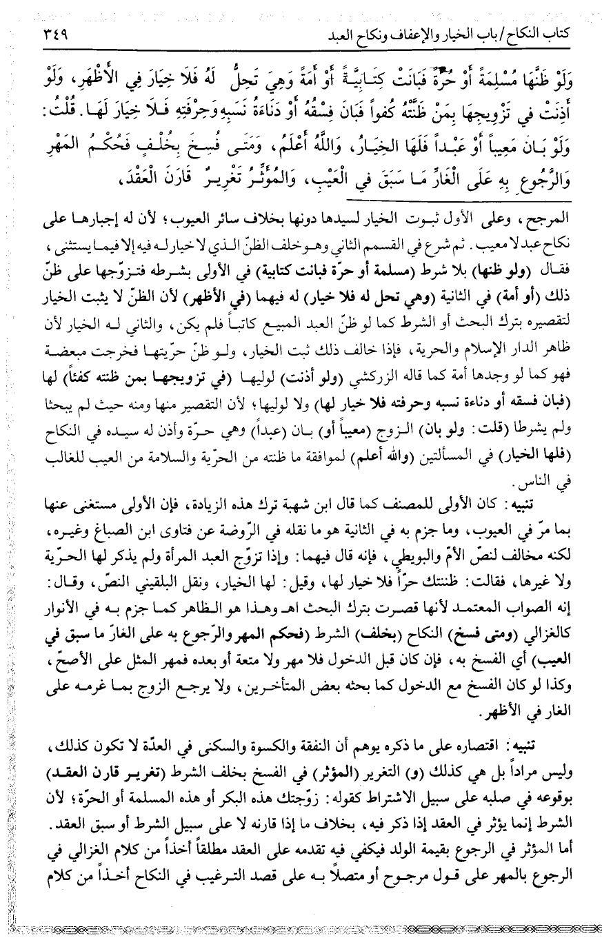 تَنْبِيهٌ: كَانَ الْأَوْلَى لِلْمُصَنِّفِ كَمَا قَالَ ابْنُ شُهْبَةَ تَرْكَ هَذِهِ الزِّيَادَةِ، فَإِنَّ الْأُولَى مُسْتَغْنًى عَنْهَا بِمَا مَرَّ فِي الْعُيُوبِ، وَمَا جَزَمَ بِهِ فِي الثَّانِيَةِ هُوَ مَا نَقَلَهُ فِي الرَّوْضَةِ عَنْ فَتَاوَى ابْنِ الصَّبَّاغِ وَغَيْرِهِ، لَكِنَّهُ مُخَالِفٌ لِنَصِّ الْأُمِّ وَالْبُوَيْطِيِّ، فَإِنَّهُ قَالَ فِيهِمَا: وَإِذَا تَزَوَّجَ الْعَبْدُ الْمَرْأَةَ وَلَمْ يَذْكُرْ لَهَا الْحُرِّيَّةَ وَلَا غَيْرَهَا، فَقَالَتْ: ظَنَنْتُك حُرًّا فَلَا خِيَارَ لَهَا، وَقِيلَ: لَهَا الْخِيَارُ، وَنَقَلَ الْبُلْقِينِيُّ النَّصَّ، وَقَالَ: إنَّهُ الصَّوَابُ الْمُعْتَمَدُ لِأَنَّهَا قَصَّرَتْ بِتَرْكِ الْبَحْثِ اهـ.