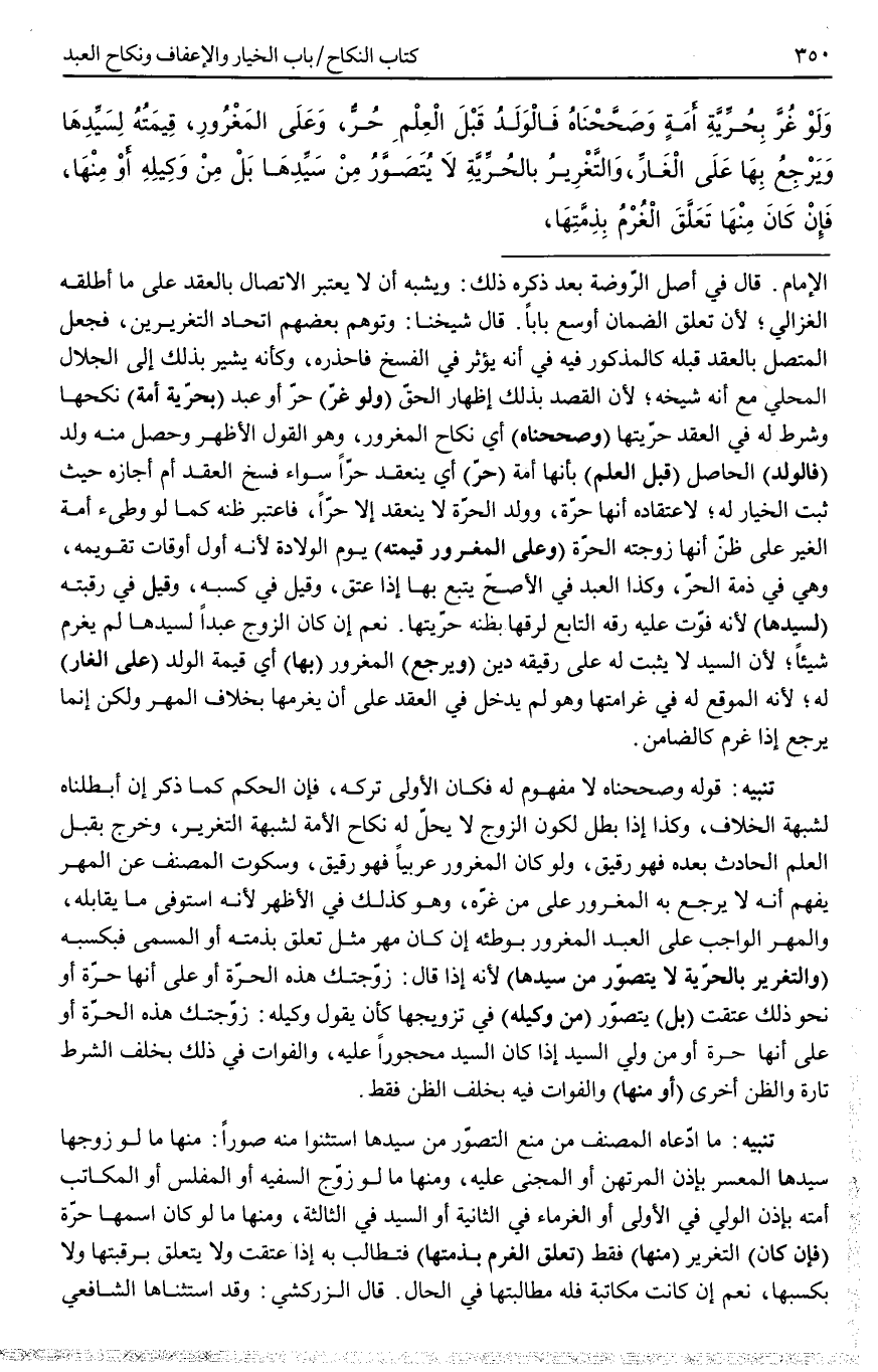 ـــــــــــــــــــــــــــــQالْإِمَامِ. قَالَ فِي أَصْلِ الرَّوْضَةِ بَعْدَ ذِكْرِهِ ذَلِكَ: وَيُشْبِهُ أَنْ لَا يَعْتَبِرَ الِاتِّصَالَ بِالْعَقْدِ عَلَى مَا أَطْلَقَهُ الْغَزَالِيُّ؛ لِأَنَّ تَعَلُّقَ الضَّمَانِ أَوْسَعُ بَابًا. قَالَ شَيْخُنَا: وَتَوَهَّمَ بَعْضُهُمْ اتِّحَادَ التَّغْرِيرَيْنِ، فَجَعَلَ الْمُتَّصِلَ بِالْعَقْدِ قَبْلَهُ كَالْمَذْكُورِ فِيهِ فِي أَنَّهُ يُؤَثِّرُ فِي الْفَسْخِ فَاحْذَرْهُ، وَكَأَنَّهُ يُشِيرُ بِذَلِكَ إلَى الْجَلَالِ الْمَحَلِّيِّ مَعَ أَنَّهُ شَيْخُهُ؛ لِأَنَّ الْقَصْدَ بِذَلِكَ إظْهَارُ الْحَقِّ (وَلَوْ غُرَّ) حُرٌّ أَوْ عَبْدٌ (بِحُرِّيَّةِ أَمَةٍ) نَكَحَهَا وَشَرَطَ لَهُ الْعَقْدُ حُرِّيَّتَهَا (وَصَحَّحْنَاهُ) أَيْ نِكَاحَ الْمَغْرُورِ، وَهُوَ الْقَوْلُ الْأَظْهَرُ وَحَصَلَ مِنْهُ وَلَدٌ (فَالْوَلَدُ) الْحَاصِلُ (قَبْلَ الْعِلْمِ) بِأَنَّهَا أَمَةٌ (حُرٌّ) أَيْ يَنْعَقِدُ حُرًّا سَوَاءٌ فَسَخَ الْعَقْدَ أَمْ أَجَازَهُ حَيْثُ ثَبَتَ الْخِيَارُ لَهُ؛ لِاعْتِقَادِهِ أَنَّهَا حُرَّةٌ، وَوَلَدُ الْحُرَّةِ لَا يَنْعَقِدُ إلَّا حُرًّا، فَاعْتُبِرَ ظَنُّهُ كَمَا لَوْ وَطِئَ أَمَةَ الْغَيْرِ عَلَى ظَنِّ أَنَّهَا زَوْجَتُهُ الْحُرَّةُ (وَعَلَى الْمَغْرُورِ قِيمَتُهُ) يَوْمَ الْوِلَادَةِ لِأَنَّهُ أَوَّلُ أَوْقَاتِ تَقْوِيمِهِ، وَهِيَ فِي ذِمَّةِ الْحُرِّ، وَكَذَا الْعَبْدُ فِي الْأَصَحِّ يُتْبَعُ بِهَا إذَا عَتَقَ، وَقِيلَ فِي كَسْبِهِ، وَقِيلَ فِي رَقَبَتِهِ (لِسَيِّدِهَا) لِأَنَّهُ فَوَّتَ عَلَيْهِ رِقَّهُ التَّابِعَ لِرِقِّهَا بِظَنِّهِ حُرِّيَّتَهَا. نَعَمْ إنْ كَانَ الزَّوْجُ عَبْدًا لِسَيِّدِهَا لَمْ يَغْرَمْ شَيْئًا؛ لِأَنَّ السَّيِّدَ لَا يَثْبُتُ لَهُ عَلَى رَقِيقِهِ دَيْنٌ (وَيَرْجِعُ) الْمَغْرُورُ (بِهَا) أَيْ قِيمَةِ الْوَلَدِ (عَلَى الْغَارِّ) لَهُ؛ لِأَنَّهُ الْمُوقِعُ لَهُ فِي غَرَامَتِهَا وَهُوَ لَمْ يَدْخُلْ فِي الْعَقْدِ عَلَى أَنْ يُغَرِّمَهَا بِخِلَافِ الْمَهْرِ وَلَكِنْ إنَّمَا يَرْجِعُ إذَا غَرِمَ كَالضَّامِنِ.