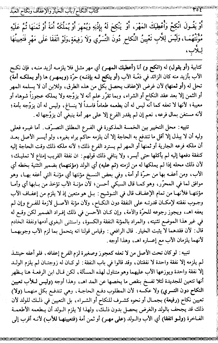 ـــــــــــــــــــــــــــــQكِتَابِيَّةً (أَوْ يَقُولَ) لَهُ (انْكِحْ وَ) أَنَا (أُعْطِيَكَ الْمَهْرَ) أَيْ مَهْرَ مِثْلٍ فَلَا يَلْزَمُهُ أَزْيَدُ مِنْهُ، فَإِنْ نَكَحَ الْأَبُ بِأَزْيَدَ مِنْهُ كَانَ الزَّائِدُ فِي ذِمَّةِ الْأَبِ (أَوْ يَنْكِحَ لَهُ بِإِذْنِهِ) حُرَّةً (وَيُمْهِرَ) هَا (أَوْ يُمَلِّكَهُ أَمَةً) تَحِلُّ لَهُ (أَوْ ثَمَنَهَا) لِأَنَّ غَرَضَ الْإِعْفَافِ يَحْصُلُ بِكُلٍّ مِنْ هَذِهِ الطُّرُقِ، وَلِلِابْنِ أَنْ لَا يُسَلِّمَهُ الْمَهْرَ أَوْ الثَّمَنَ إلَّا بَعْدَ عَقْدِ النِّكَاحِ أَوْ الشِّرَاءِ، وَبِمَا تَقَرَّرَ عُلِمَ أَنَّهُ لَا يُزَوِّجُهُ وَلَا يُمَلِّكُهُ عَجُوزًا شَوْهَاءَ أَوْ مَعِيبَةً؛ لِأَنَّهَا لَا تُعِفُّهُ كَمَا أَنَّهُ لَيْسَ لَهُ أَنْ يُطْعِمَهُ طَعَامًا فَاسِدًا لَا يَنْسَاغُ، وَلَيْسَ لَهُ أَنْ يُزَوِّجَهُ بِأَمَةٍ؛ لِأَنَّهُ مُسْتَغْنٍ بِمَالِ فَرْعِهِ، نَعَمْ إنْ لَمْ يَقْدِرْ الْفَرْعُ إلَّا عَلَى مَهْرِ أَمَةٍ يَنْبَغِي أَنْ يُزَوِّجَهَا لَهُ.