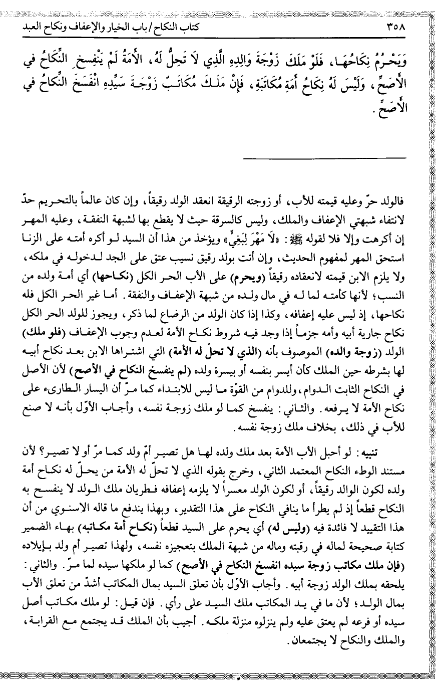 تَنْبِيهٌ: لَوْ أَحْبَلَ الْأَبُ الْأَمَةَ بَعْدَ مِلْكِ وَلَدِهِ لَهَا هَلْ تَصِيرُ أُمَّ وَلَدٍ كَمَا مَرَّ أَوْ لَا تَصِيرُ؟ لِأَنَّ مُسْتَنَدَ الْوَطْءِ النِّكَاحُ الْمُعْتَمَدُ الثَّانِي، وَخَرَجَ بِقَوْلِهِ الَّذِي لَا تَحِلُّ لَهُ الْأَمَةُ مَنْ يَحِلُّ لَهُ نِكَاحُ أَمَةِ وَلَدِهِ لِكَوْنِ الْوَالِدِ رَقِيقًا، أَوْ لِكَوْنِ الْوَلَدِ مُعْسِرًا لَا يَلْزَمُهُ إعْفَافُهُ فَطَرَيَانُ مِلْكِ الْوَلَدِ لَا يَنْفَسِخُ بِهِ النِّكَاحُ قَطْعًا إذْ لَمْ يَطْرَأْ مَا يُنَافِي النِّكَاحَ عَلَى هَذَا التَّقْدِيرِ، وَبِهَذَا يَنْدَفِعُ مَا قَالَهُ الْإِسْنَوِيُّ مِنْ أَنَّ هَذَا التَّقْيِيدَ لَا فَائِدَةَ فِيهِ.