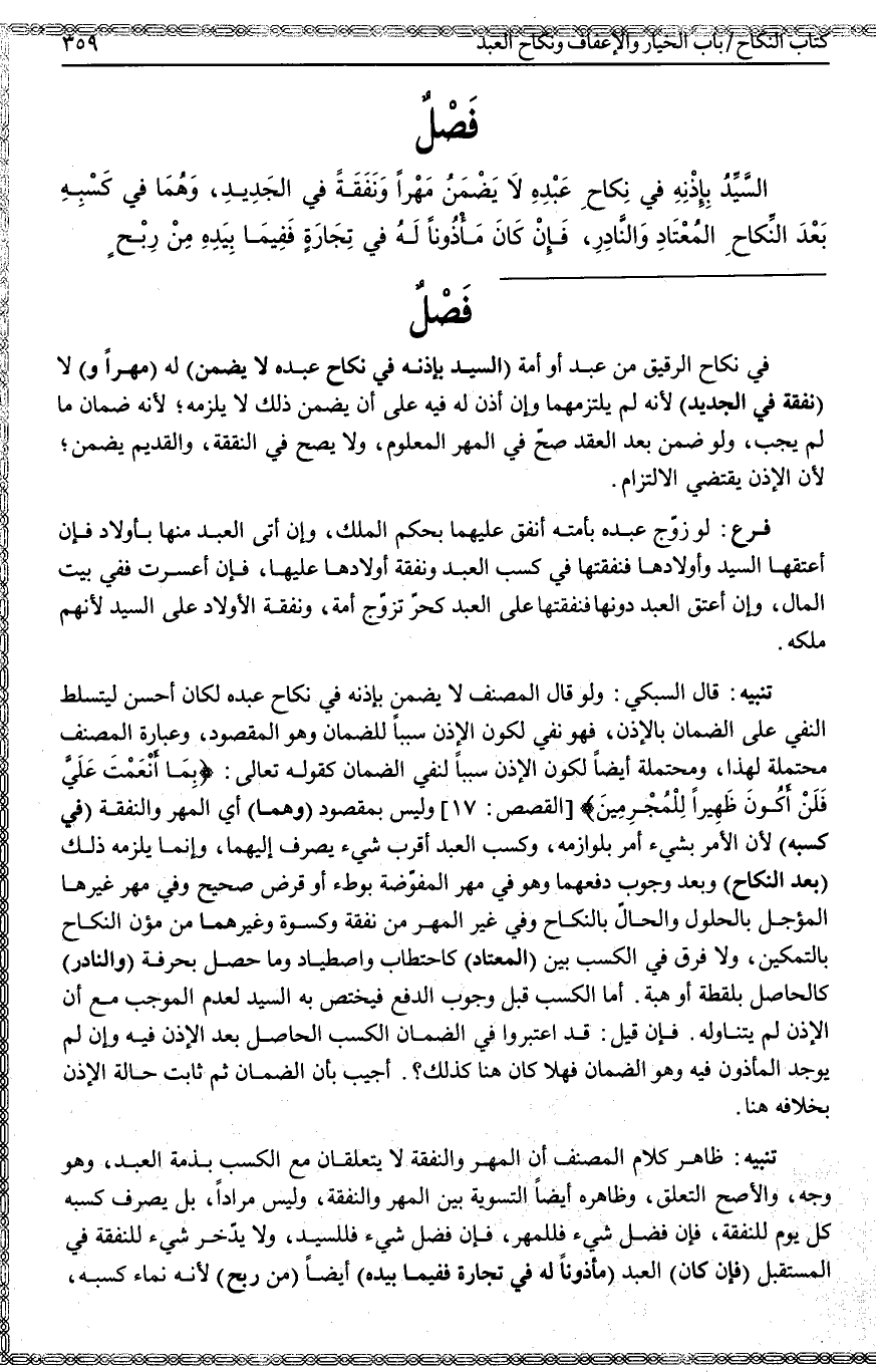 فَصْلٌ السَّيِّدُ بِإِذْنِهِ فِي نِكَاحِ عَبْدِهِ لَا يَضْمَنُ مَهْرًا وَنَفَقَةً فِي الْجَدِيدِ، وَهُمَا فِي كَسْبِهِ بَعْدَ النِّكَاحِ الْمُعْتَادِ وَالنَّادِرِ، فَإِنْ كَانَ مَأْذُونًا لَهُ فِي تِجَارَةٍ فَفِيمَا بِيَدِهِ مِنْ رِبْحٍ