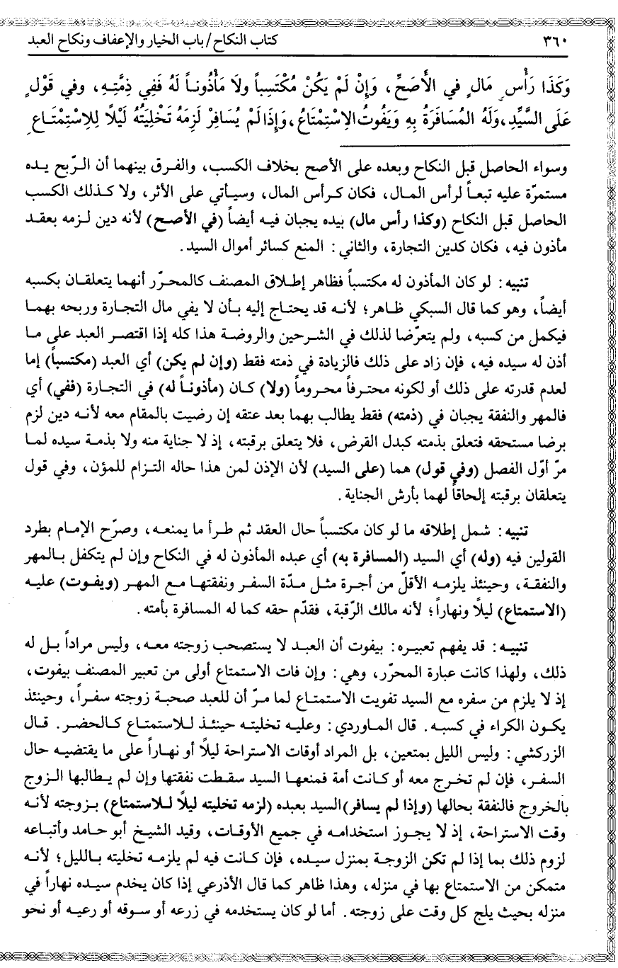 تَنْبِيهٌ: قَدْ يُفْهِمُ تَعْبِيرُهُ: بِيَفُوتُ أَنَّ الْعَبْدَ لَا يَسْتَصْحِبُ زَوْجَتَهُ مَعَهُ، وَلَيْسَ مُرَادًا بَلْ لَهُ ذَلِكَ، وَلِهَذَا كَانَتْ عِبَارَةُ الْمُحَرَّرِ، وَهِيَ: وَإِنْ فَاتَ الِاسْتِمْتَاعُ أَوْلَى مِنْ تَعْبِيرِ الْمُصَنِّفِ بِيَفُوتُ، إذْ لَا يَلْزَمُ مِنْ سَفَرِهِ مَعَ السَّيِّدِ تَفْوِيتُ الِاسْتِمْتَاعِ لِمَا مَرَّ أَنَّ لِلْعَبْدِ صُحْبَةَ زَوْجَتِهِ سَفَرًا، وَحِينَئِذٍ يَكُونُ الْكِرَاءُ فِي كَسْبِهِ. قَالَ الْمَاوَرْدِيُّ: وَعَلَيْهِ تَخْلِيَتُهُ حِينَئِذٍ لِلِاسْتِمْتَاعِ كَالْحَضَرِ. قَالَ الزَّرْكَشِيُّ: وَلَيْسَ اللَّيْلُ بِمُتَعَيَّنٍ، بَلْ الْمُرَادُ أَوْقَاتُ الِاسْتِرَاحَةِ لَيْلًا أَوْ نَهَارًا عَلَى مَا يَقْتَضِيهِ حَالُ السَّفَرِ، فَإِنْ لَمْ تَخْرُجْ مَعَهُ أَوْ كَانَتْ أَمَةً فَمَنَعَهَا السَّيِّدُ سَقَطَتْ نَفَقَتُهَا وَإِنْ لَمْ يُطَالِبْهَا الزَّوْجُ بِالْخُرُوجِ فَالنَّفَقَةُ بِحَالِهَا (وَإِذَا لَمْ يُسَافِرْ) السَّيِّدُ بِعَبْدِهِ (لَزِمَهُ تَخْلِيَتُهُ لَيْلًا لِلِاسْتِمْتَاعِ) بِزَوْجَتِهِ لِأَنَّهُ وَقْتُ الِاسْتِرَاحَةِ، إذْ لَا يَجُوزُ اسْتِخْدَامُهُ فِي جَمِيعِ الْأَوْقَاتِ، وَقَيَّدَ الشَّيْخُ أَبُو حَامِدٍ وَأَتْبَاعُهُ لُزُومَ ذَلِكَ بِمَا إذَا لَمْ تَكُنْ الزَّوْجَةُ بِمَنْزِلِ سَيِّدِهِ، فَإِنْ كَانَتْ فِيهِ لَمْ يَلْزَمْهُ تَخْلِيَتُهُ بِاللَّيْلِ؛ لِأَنَّهُ مُتَمَكِّنٌ مِنْ الِاسْتِمْتَاعِ بِهَا فِي مَنْزِلِهِ، وَهَذَا ظَاهِرٌ كَمَا قَالَ الْأَذْرَعِيُّ إذَا كَانَ يَخْدِمُ سَيِّدَهُ نَهَارًا فِي مَنْزِلِهِ بِحَيْثُ يَلِجُ كُلَّ وَقْتٍ عَلَى زَوْجَتِهِ. أَمَّا لَوْ كَانَ يَسْتَخْدِمُهُ فِي زَرْعِهِ أَوْ سُوقِهِ أَوْ رَعْيِهِ أَوْ نَحْوِ