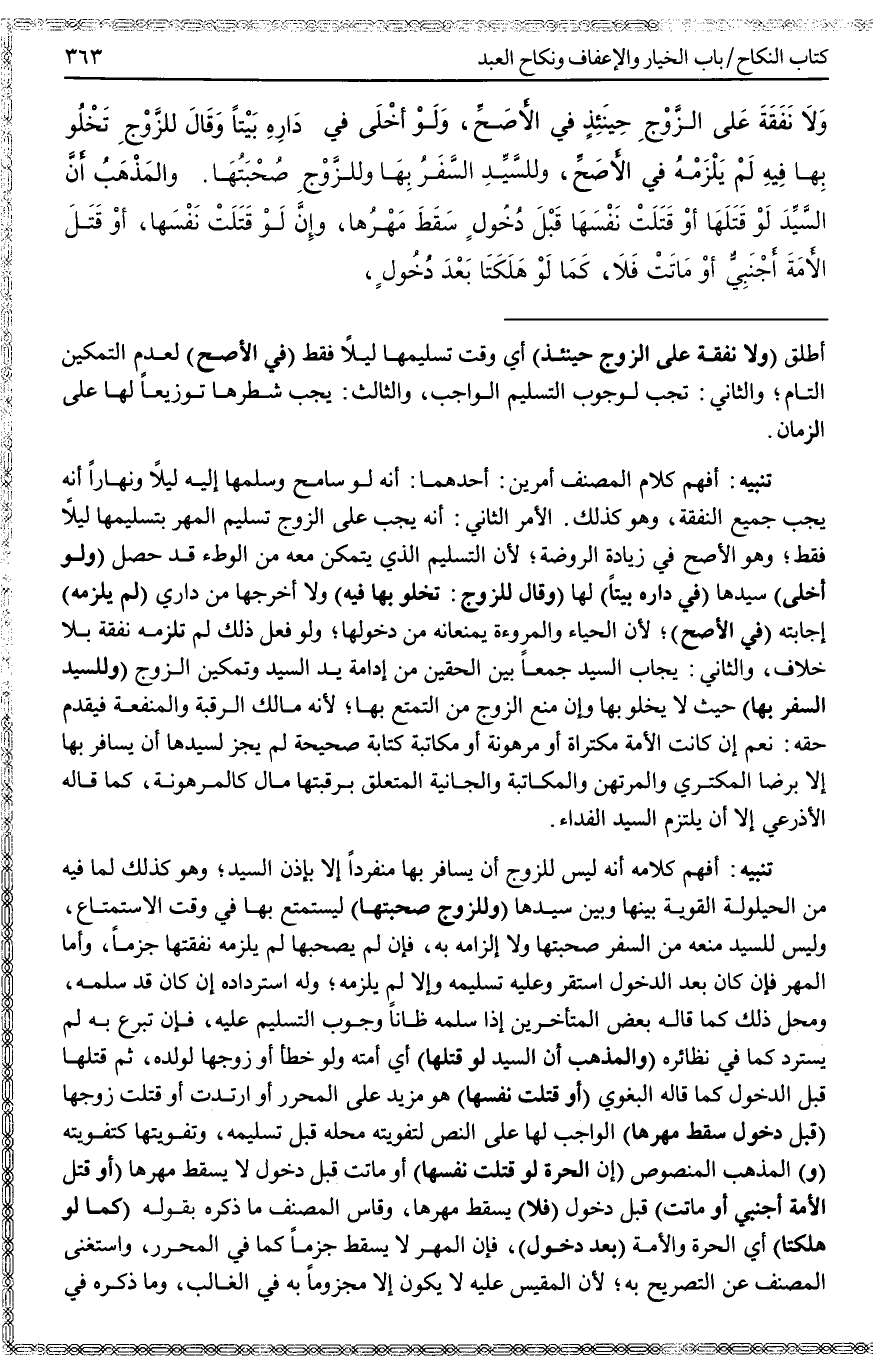 تَنْبِيهٌ: أَفْهَمَ كَلَامُهُ أَنَّهُ لَيْسَ لِلزَّوْجِ أَنْ يُسَافِرَ بِهَا مُنْفَرِدًا إلَّا بِإِذْنِ السَّيِّدِ وَهُوَ كَذَلِكَ لِمَا فِيهِ مِنْ الْحَيْلُولَةِ الْقَوِيَّةِ بَيْنَهَا وَبَيْنَ سَيِّدِهَا (وَلِلزَّوْجِ صُحْبَتُهَا) لِيَسْتَمْتِعَ بِهَا فِي وَقْتِ الِاسْتِمْتَاعِ، وَلَيْسَ لِلسَّيِّدِ مَنْعُهُ مِنْ السَّفَرِ وَصُحْبَتِهَا وَلَا إلْزَامُهُ بِهِ، فَإِنْ لَمْ يَصْحَبْهَا لَمْ يُلْزِمْهُ نَفَقَتَهَا جَزْمًا، وَأَمَّا الْمَهْرُ فَإِنْ كَانَ بَعْدَ الدُّخُولِ اسْتَقَرَّ وَعَلَيْهِ تَسْلِيمُهُ وَإِلَّا لَمْ يَلْزَمْهُ؛ وَلَهُ اسْتِرْدَادُهُ إنْ كَانَ قَدْ سَلَّمَهُ، وَمَحَلُّ ذَلِكَ كَمَا قَالَهُ بَعْضُ الْمُتَأَخِّرِينَ إذَا سَلَّمَهُ ظَانًّا وُجُوبَ التَّسْلِيمِ عَلَيْهِ، فَإِنْ تَبَرَّعَ بِهِ لَمْ يَسْتَرِدَّ كَمَا فِي نَظَائِرِهِ.