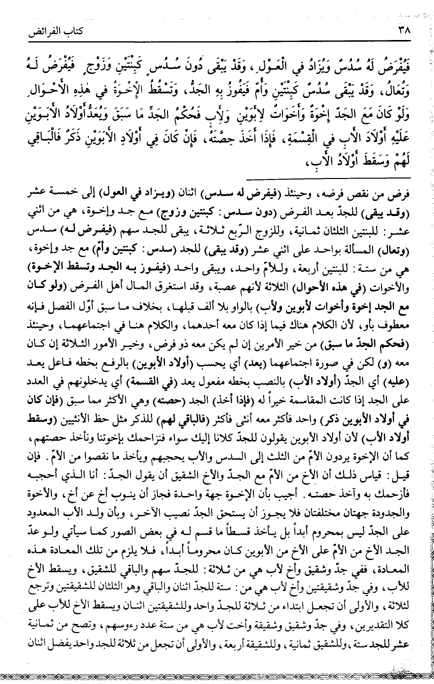 ـــــــــــــــــــــــــــــQفَرْضِ مَنْ نَقَصَ فَرْضُهُ، وَحِينَئِذٍ (فَيُفْرَضُ لَهُ سُدُسٌ) اثْنَانِ (وَيُزَادُ فِي الْعَوْلِ) إلَى خَمْسَةَ عَشَرَ (وَقَدْ يَبْقَى) لِلْجَدِّ بَعْدَ الْفَرْضِ (دُونَ سُدُسٍ: كَبِنْتَيْنِ وَزَوْجٍ) مَعَ جَدٍّ وَإِخْوَةٍ، هِيَ مِنْ اثْنَيْ عَشَرَ: لِلْبِنْتَيْنِ الثُّلُثَانِ ثَمَانِيَةٌ، وَلِلزَّوْجِ الرُّبُعُ ثَلَاثَةٌ، يَبْقَى لِلْجَدِّ سَهْمٌ (فَيُفْرَضُ لَهُ) سُدُسٌ (وَتُعَالُ) الْمَسْأَلَةُ بِوَاحِدٍ عَلَى اثْنَيْ عَشَرَ (وَقَدْ يَبْقَى) لِلْجَدِّ (سُدُسٌ: كَبِنْتَيْنِ وَأُمٍّ) مَعَ جَدٍّ وَإِخْوَةٍ، هِيَ مِنْ سِتَّةٍ: لِلْبِنْتَيْنِ أَرْبَعَةٌ، وَلِلْأُمِّ وَاحِدٌ، وَيَبْقَى وَاحِدٌ (فَيَفُوزُ بِهِ الْجَدُّ وَتَسْقُطُ الْإِخْوَةُ) وَالْأَخَوَاتُ (فِي هَذِهِ الْأَحْوَالِ) الثَّلَاثَةِ لِأَنَّهُمْ عَصَبَةٌ، وَقَدْ اسْتَغْرَقَ الْمَالُ أَهْلَ الْفَرْضِ (وَلَوْ كَانَ مَعَ الْجَدِّ إخْوَةٌ وَأَخَوَاتٌ لِأَبَوَيْنِ وَلِأَبٍ) بِالْوَاوِ بِلَا أَلِفٍ قَبْلَهَا، بِخِلَافِ مَا سَبَقَ أَوَّلَ الْفَصْلِ فَإِنَّهُ مَعْطُوفٌ بِأَوْ؛ لِأَنَّ الْكَلَامَ هُنَاكَ فِيمَا إذَا كَانَ مَعَهُ أَحَدُهُمَا، وَالْكَلَامَ هُنَا فِي اجْتِمَاعِهِمَا، وَحِينَئِذٍ (فَحُكْمُ الْجَدِّ مَا سَبَقَ) مِنْ خَيْرِ الْأَمْرَيْنِ إنْ لَمْ يَكُنْ مَعَهُ ذُو فَرْضٍ، وَخَيْرُ الْأُمُورِ الثَّلَاثَةِ إنْ كَانَ مَعَهُ (وَ) لَكِنْ فِي صُورَةِ اجْتِمَاعِهِمَا (يَعُدُّ) أَيْ يَحْسُبُ (أَوْلَادُ الْأَبَوَيْنِ) بِالرَّفْعِ بِخَطِّهِ فَاعِلُ يَعُدُّ (عَلَيْهِ) أَيْ الْجَدِّ (أَوْلَادَ الْأَبِ) بِالنَّصْبِ بِخَطِّهِ مَفْعُولُ يَعُدُّ (فِي الْقِسْمَةِ) أَيْ: يُدْخِلُونَهُمْ فِي الْعَدَدِ عَلَى الْجَدِّ إذَا كَانَتْ الْمُقَاسَمَةُ خَيْرًا لَهُ (فَإِذَا أَخَذَ) الْجَدُّ (حِصَّتَهُ) وَهِيَ الْأَكْثَرُ مِمَّا سَبَقَ (فَإِنْ كَانَ فِي أَوْلَادِ الْأَبَوَيْنِ ذَكَرٌ) وَاحِدٌ فَأَكْثَرُ مَعَهُ أُنْثَى فَأَكْثَرُ (فَالْبَاقِي لَهُمْ) لِلذَّكَرِ مِثْلُ حَظِّ الْأُنْثَيَيْنِ (وَسَقَطَ أَوْلَادُ الْأَبِ) ؛ لِأَنَّ أَوْلَادَ الْأَبَوَيْنِ يَقُولُونَ لِلْجَدِّ: كِلَانَا إلَيْكَ سَوَاءٌ فَنُزَاحِمُكَ بِإِخْوَتِنَا، وَنَأْخُذُ حِصَّتَهُمْ، كَمَا أَنَّ الْإِخْوَةَ يَرُدُّونَ الْأُمَّ مِنْ الثُّلُثِ إلَى السُّدُسِ وَالْأَبُ يَحْجُبُهُمْ وَيَأْخُذُ مَا نَقَصُوا مِنْ الْأُمِّ.